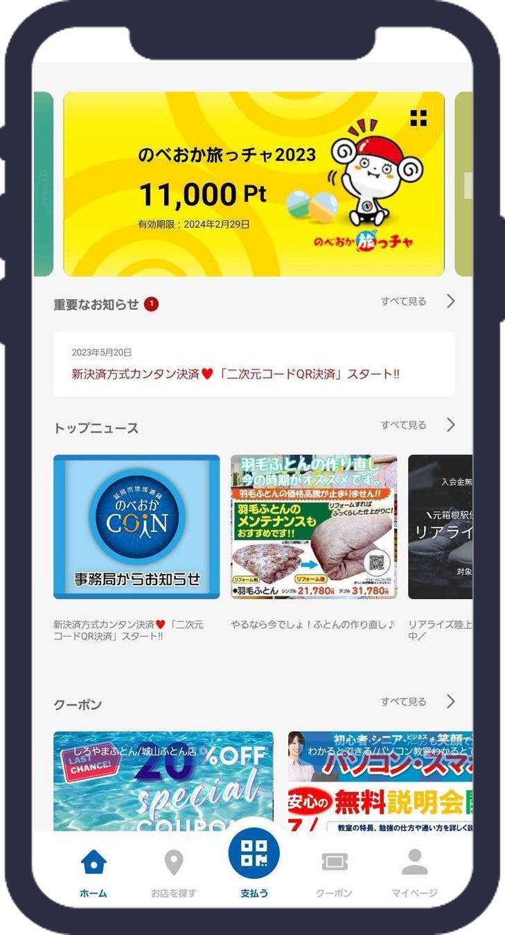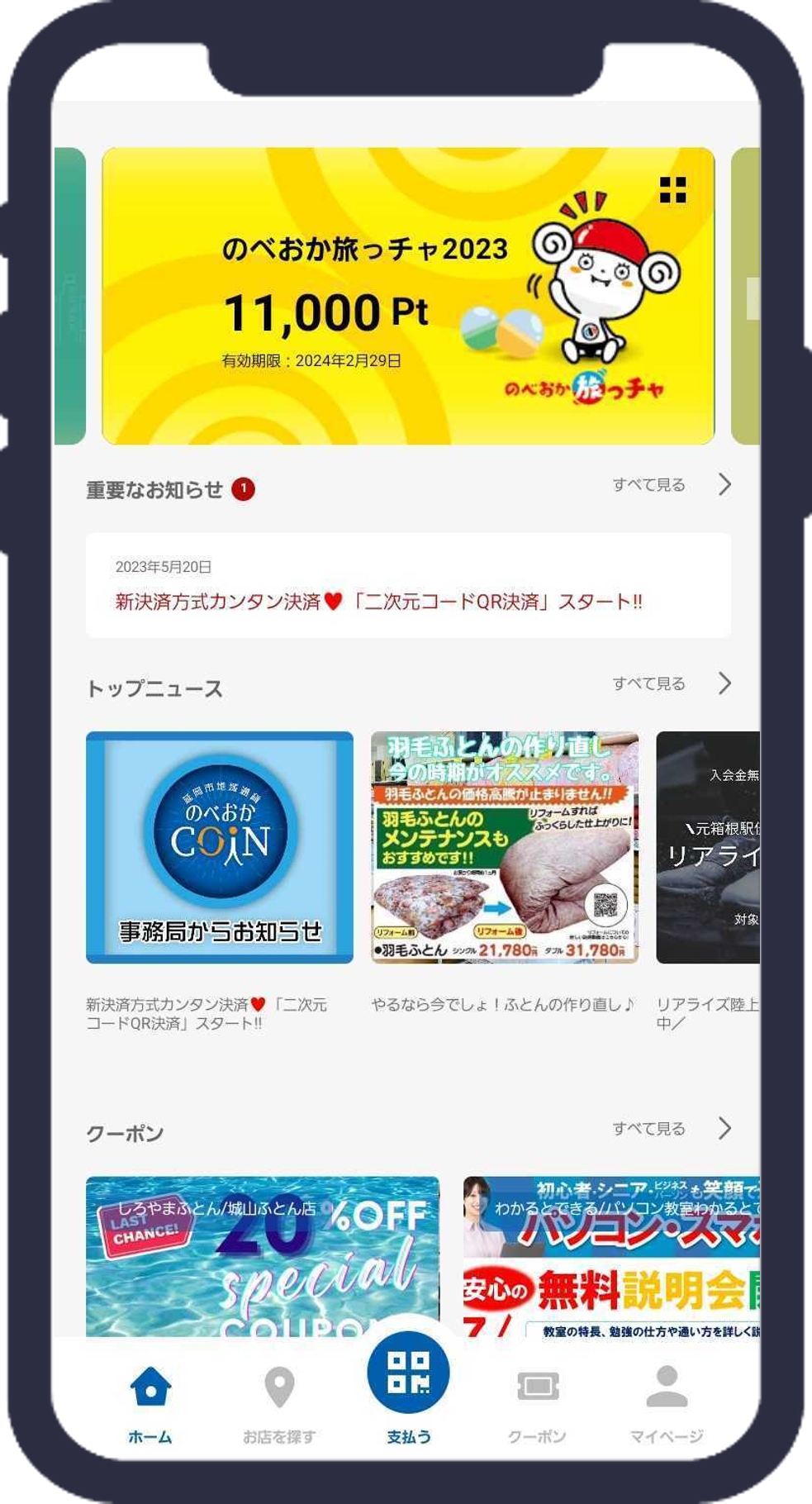 「のべおかCOIN」とは、市民がさまざまなまちづくり活動への参加や市内店舗での消費にポイントを発行する機能と、市民が現金で電子マネーをチャージすることのできるキャッシュレス機能を兼ね備えたもので、ポイントも電子マネーも市内加盟店でしか利用できない新たな地域通貨です。専用のスマートフォンアプリよりご利用いただくことができます。