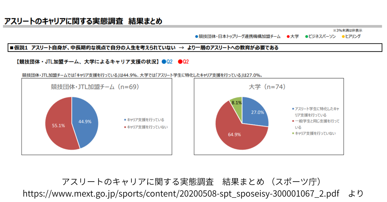 文部科学省・スポーツ庁のレポートや調査では、アスリートのキャリア課題として、「怪我などにより突然引退を余儀なくされる可能性」から、現役時代からの計画的なキャリア形成が重要であると指摘されています。しかし、支援体制は未だ十分に進んでおらず、アスリートが所属する競技団体のうち「キャリア支援を行っている」のは44.9%に留まっています。また*大学においても「アスリート学生に特化した支援」を実施しているのは27.0%に過ぎません。