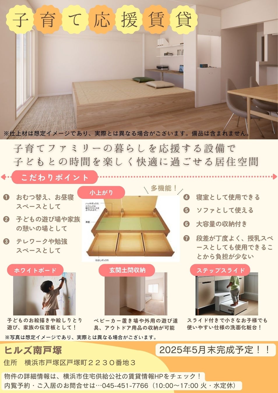 資する先駆的な取り組み(中期展望2024-2026)」の実現に向け、横浜市戸塚区に所有する公社賃貸住宅「ヒルズ南戸塚」の専有部において、子育て世帯向けの設備を取り揃えた「子育て応援賃貸」を
