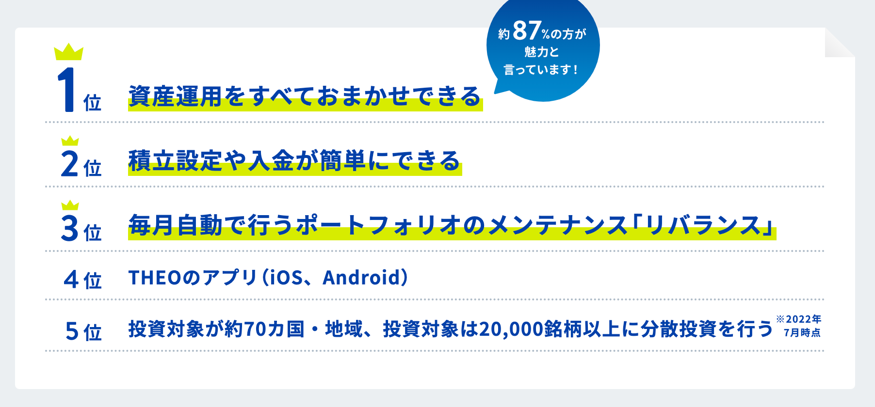 ・THEOの魅力「資産運用をすべておまかせできること」と答えた方は約87% ※5