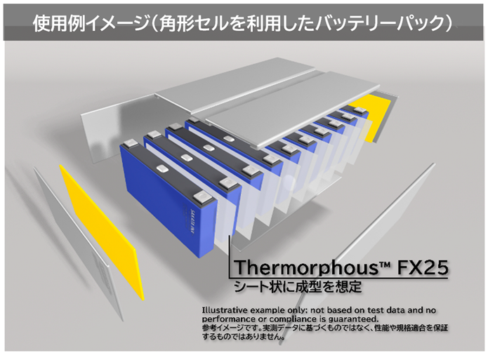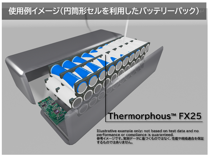 「Thermorphous™ FX25(開発品)」は、EVや電動モビリティ、静置型電源装置や無停電電源装置向けのバッテリーパックに最適な、温度応答型の熱マネジメント材料です。通常稼働温度では高い熱伝導率を発揮し、バッテリーセル間の熱拡散によりバッテリーの出力性能と高寿命化が期待できます。