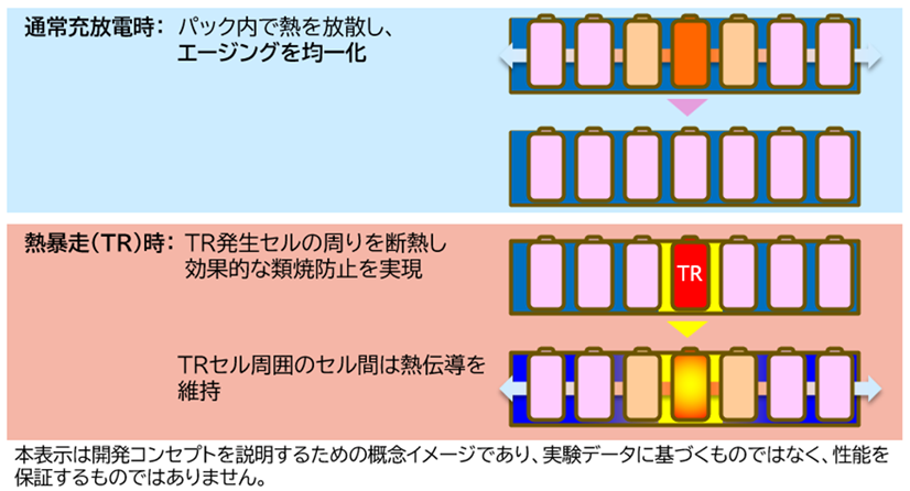 一方で、セルの熱暴走が発生する温度域に達すると熱伝導率が急激に低下し、遮熱機能を発揮します。これにより、熱暴走が発生したセルの周りを断熱、遮熱し、隣り合うセルへの類焼を防止します。このユニークな性能により、従来は両立が困難だった「安全性と出力性能」を、単一材料で実現。構造の簡素化とトータルコスト低減にも貢献します。