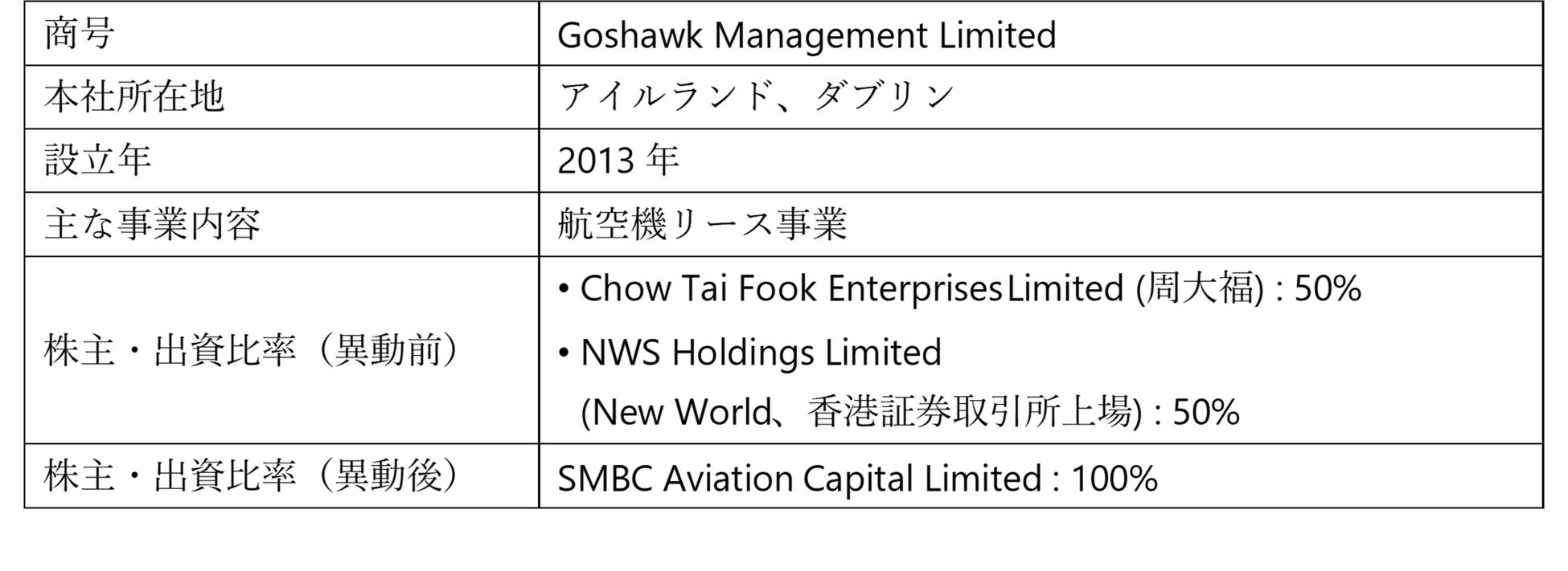 三井住友ファイナンス&リース株式会社(代表取締役社長:橘 正喜)は、傘下の航空機リース会社のSMBC Aviation Capital Limited(CEO:Peter Barrett、以下「SMBC Aviation Capital」)が、2022年5月16日に締結した株式売買契約に基づき、Chow Tai Fook Enterprises LimitedならびにNWS Holdings Limitedから航空機リース会社のGoshawk Management Limitedの全株式の取得が完了し、子会社化したことをお知らせします。