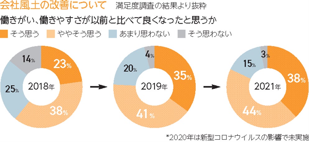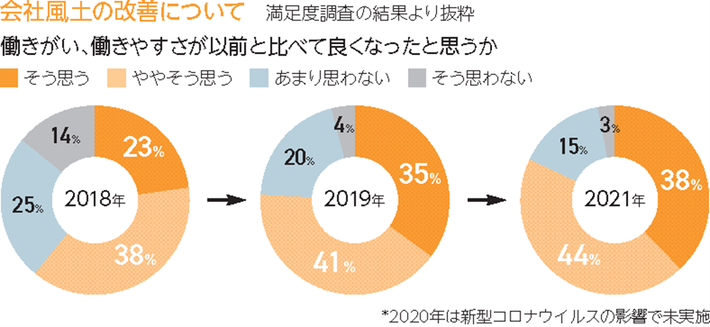2017 年から年1 回、社員向けに満足度調査を実施しており、この調査をきっかけに有給休暇の取得促進や、管理職向けの研修制度の強化が行われました。社員の「働きやすさ」と「働きがい」を高めるための様々な取組みを続けてきた結果、社員のエンゲージメントは年々改善しており、2021 年の調査では社員の8 割以上が働きがい、働きやすさが以前と比べて良くなったと回答しています。
