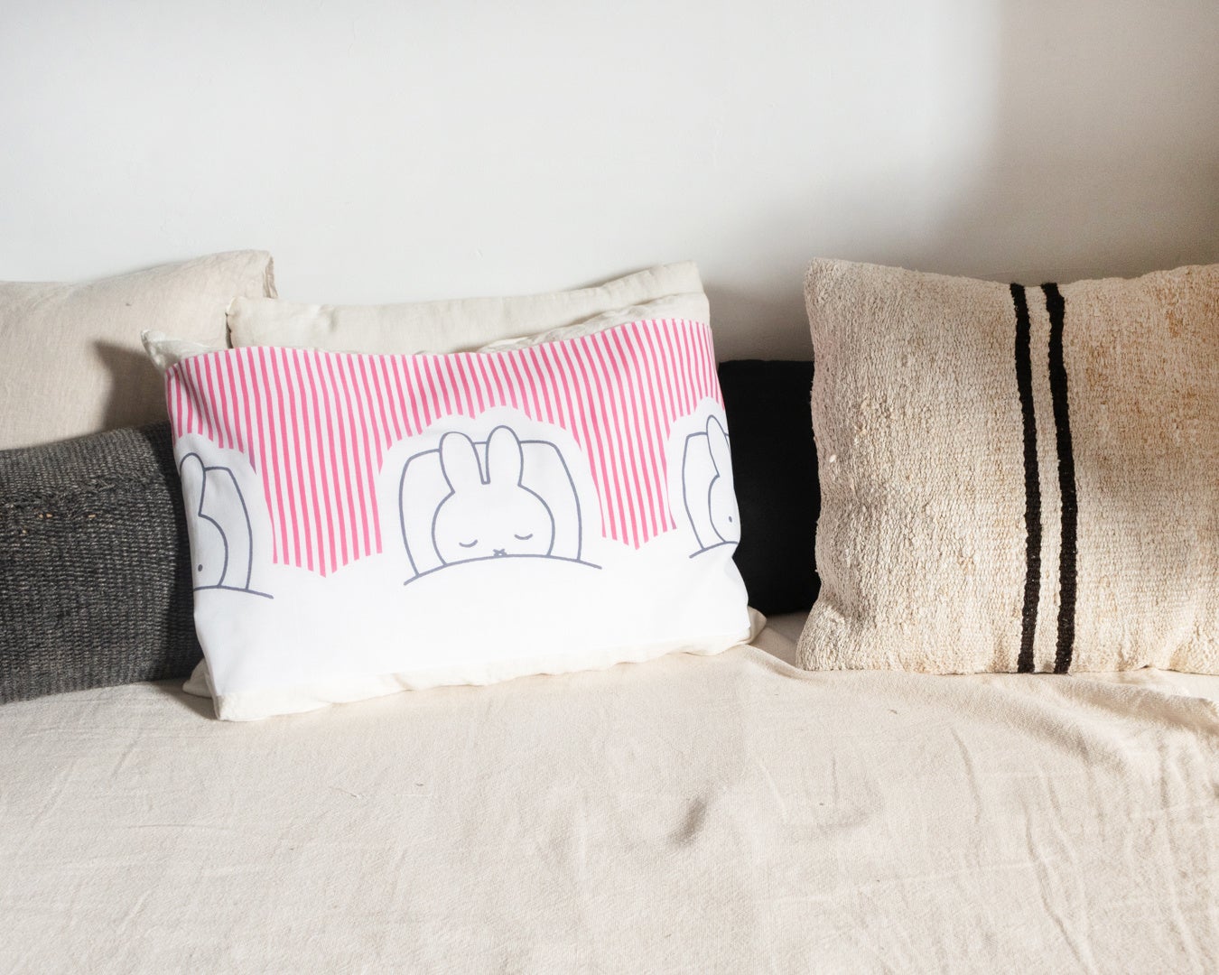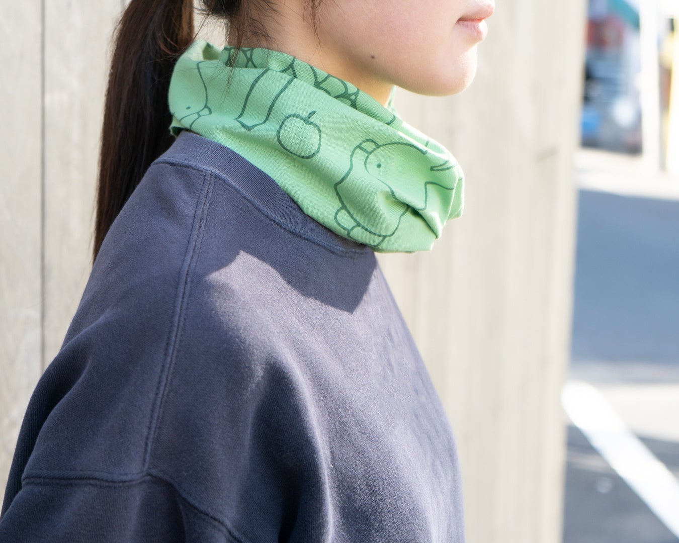 シリーズでは初となる大判サイズの風呂敷。ほどよい透け感としなやかな風合いの生地は結びやすく、荷物をまとめたり、さっと結んでサブバッグにしたり、肌寒い時にはスカーフ代わりにと、多用途に活躍します。ソフトな質感から生まれる美しいドレープは二人掛けのラウンドテーブルやコーヒーテーブルのクロスにもぴったり。大きいからこそデザインはあえてシンプルに、落ち着いた色合いで上品に仕上げました。さりげないミッフィーのモチーフが可愛らしいアクセントに。こちらも小風呂敷と同じく、職人によるハンドプリントで丁寧に染められています。
