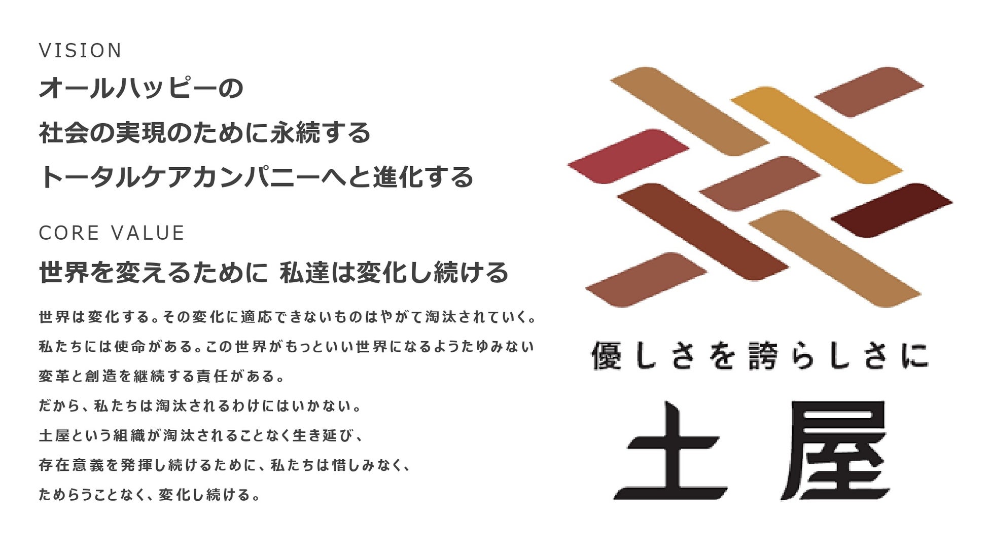 世界は変化する。その変化に適応できないものはやがて淘汰されていく。私たちには使命がある。この世界がもっといい世界になるようたゆみない変革と創造を継続する責任がある。だから、私たちは淘汰されるわけにはいかない。土屋という組織が淘汰されることなく生き延び、存在意義を発揮し続けるために、私たちは惜しみなく、ためらうことなく、変化し続ける。