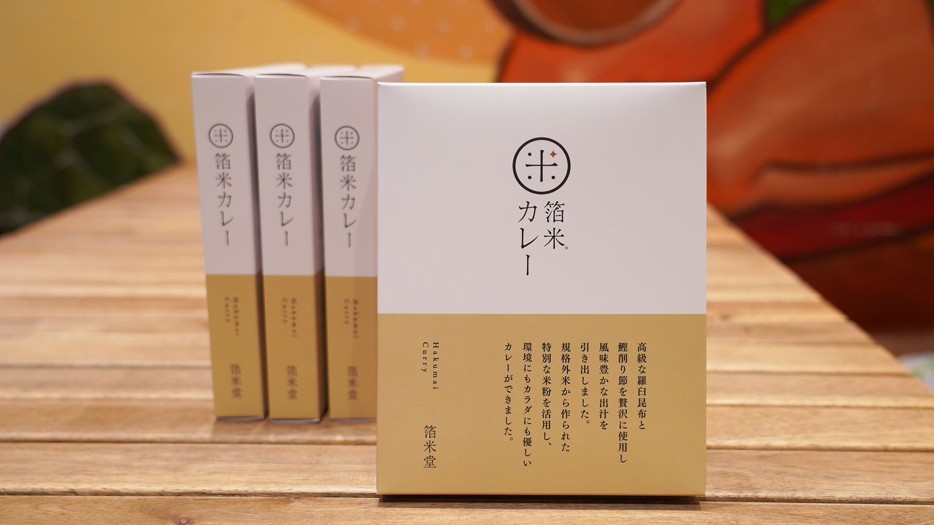米農家の間では、昨今の猛暑の影響で問題になっている、割米や未熟米などの流通されない廃棄米(規格外米)が増え続けている。その規格外米を米粉にした「箔米粉」(自社開発商品)を使用し、自社の得意分野である和風出汁のカレーと組み合わせる事で、食べるだけでSDGsに貢献できる『箔米カレー』が誕生しました。※(箔米®︎)は当社の商標登録名です