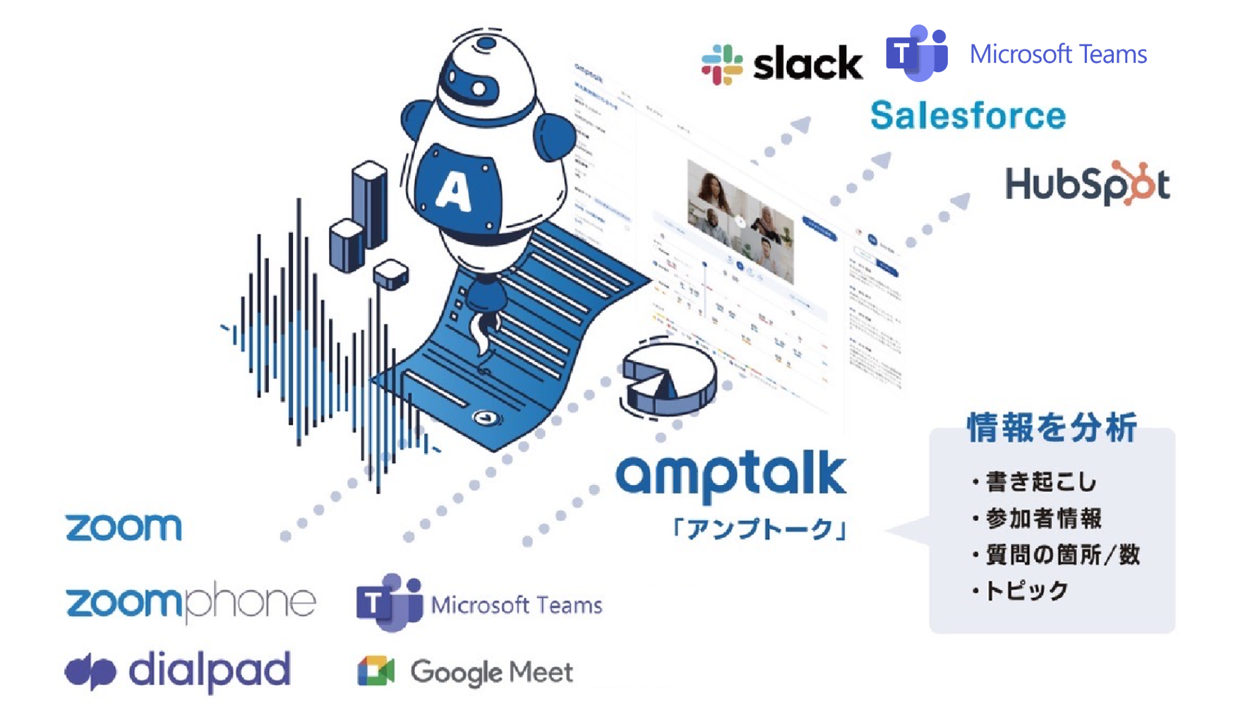 「アンプトーク」は、IP電話やテレビ会議システムなどあらゆるコミュニケーションツールと連携し、オンライン商談や架電を自動で書き起こし・要約・解析します。それらをSalesforce / HubSpot / Slack / Microsoft Teamsチャットに自動出力することで、商談を自動化・可視化します。