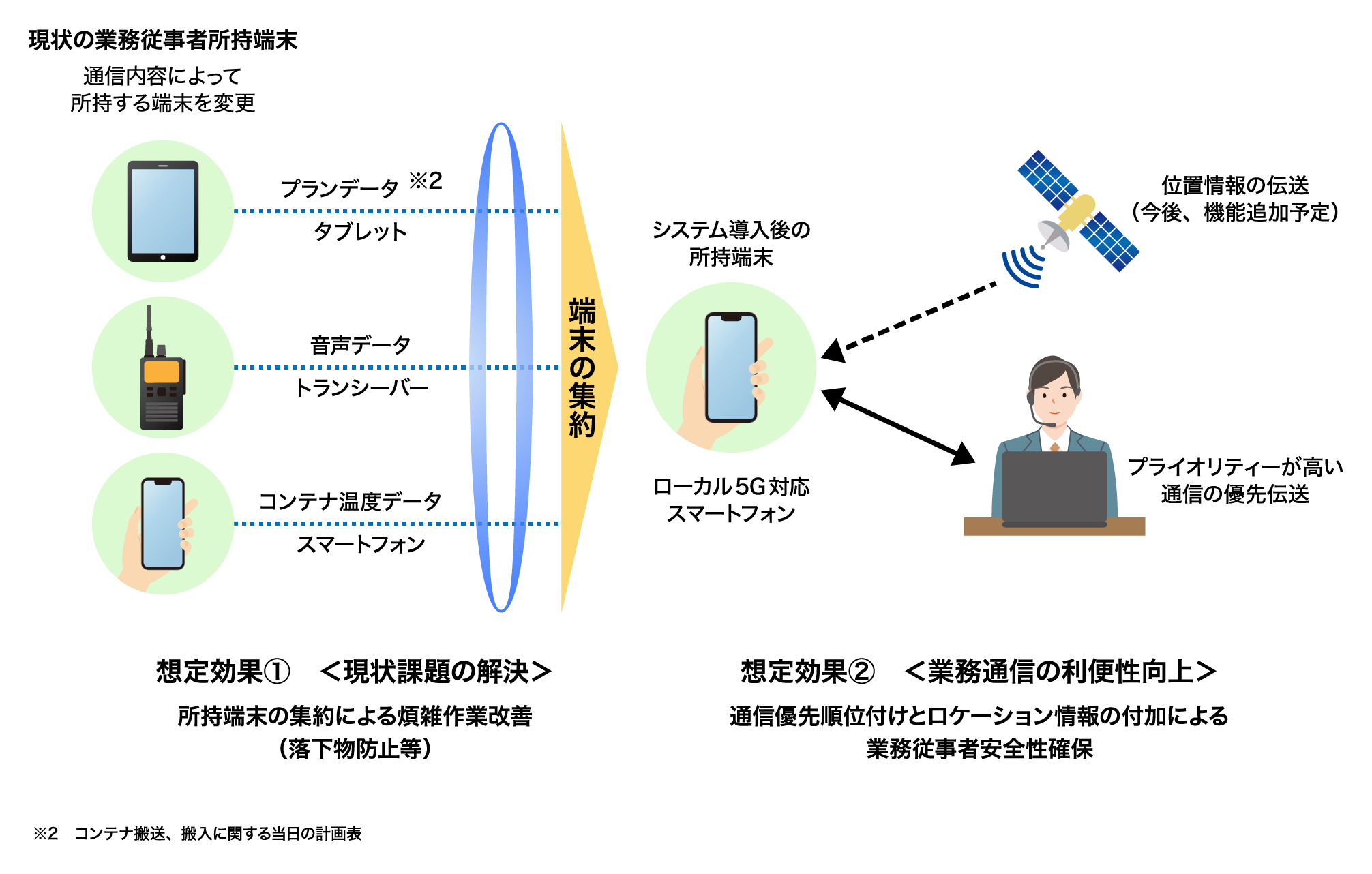このようなMCPTXの特長は、ローカル5Gプライベートネットワークの活用が想定される港湾、空港、大規模工場・プラントなどで業務に従事するスタッフ間の連携においても非常に有用です。例えば、港湾等における現状は、コンテナヤード内で管理をおこなう各スタッフが業務通信のため複数の端末を所持する必要があり、作業が非常に煩雑になることや同時並行で各端末を操作することによる危険作業が問題となっています。具体的には、スタッフ間の通話のためにトランシーバーを用い、作業データを送受信するためにタブレットやスマートフォンを活用している状況です。ローカル5Gと MCPTXを活用すれば、端末を一つに集約できる上、適切な優先制御により緊急性の高いコミュニケーションを迅速かつ確実におこなえる効果的な広域プライベート通信環境が実現できます。