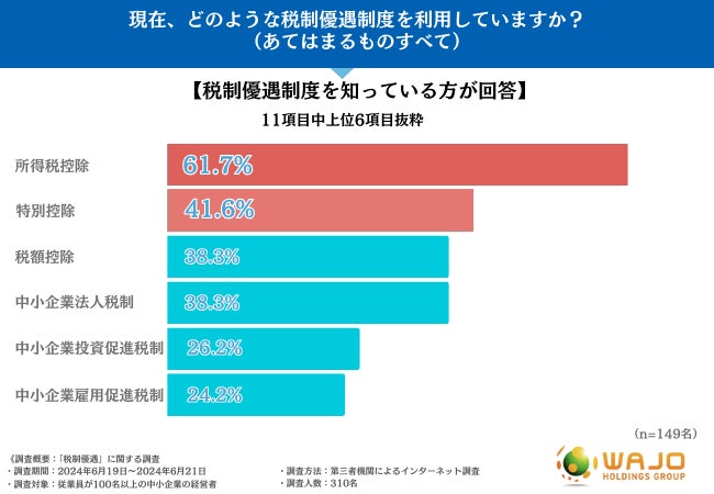 さらに、税制優遇制度を知っている経営者の方に、『現在、どのような税制優遇制度を利用していますか?(あてはまるものすべて)』と聞いたところ、「所得税控除(61.7%)」が最も多く、「特別減税(41.6%)」「税額控除(38.3%)」「中小企業法人税制(38.3%)」「中小企業投資促進税制(26.2%)」と続きました。