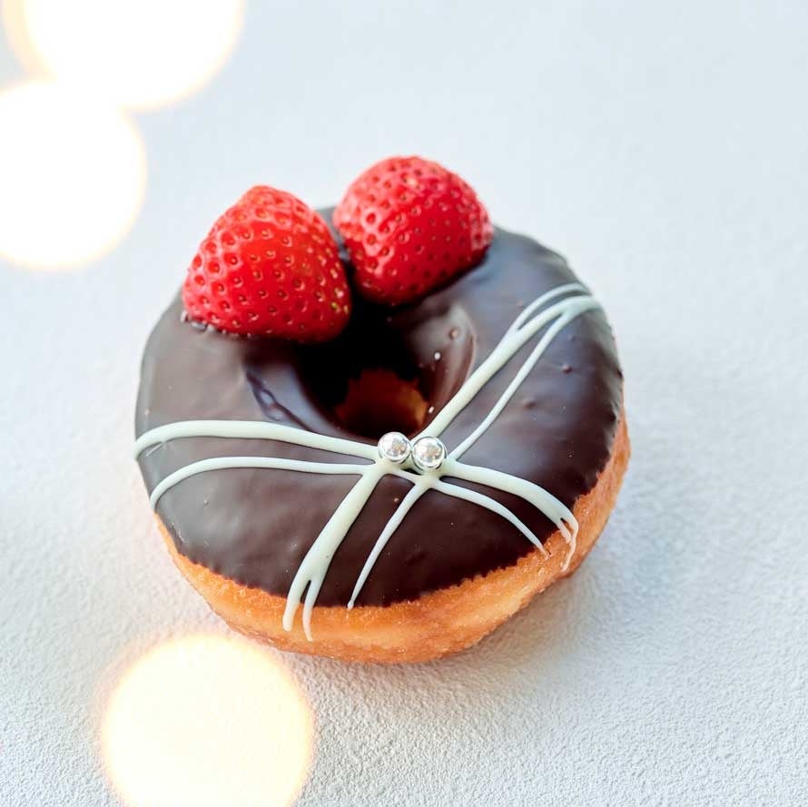 ふんわりとしたブリオッシュ生地のドーナツをチョコレートでコーティングし、ホワイトチョコレートでクリスマスギフトのリボンのようなラインをデザイン。さらに、贅沢にいちごを1個まるごとトッピングしました。チョコレートの深い茶色といちごの鮮やかな赤のコントラストが目にも楽しく、クリスマスの雰囲気を存分に引き立てます。