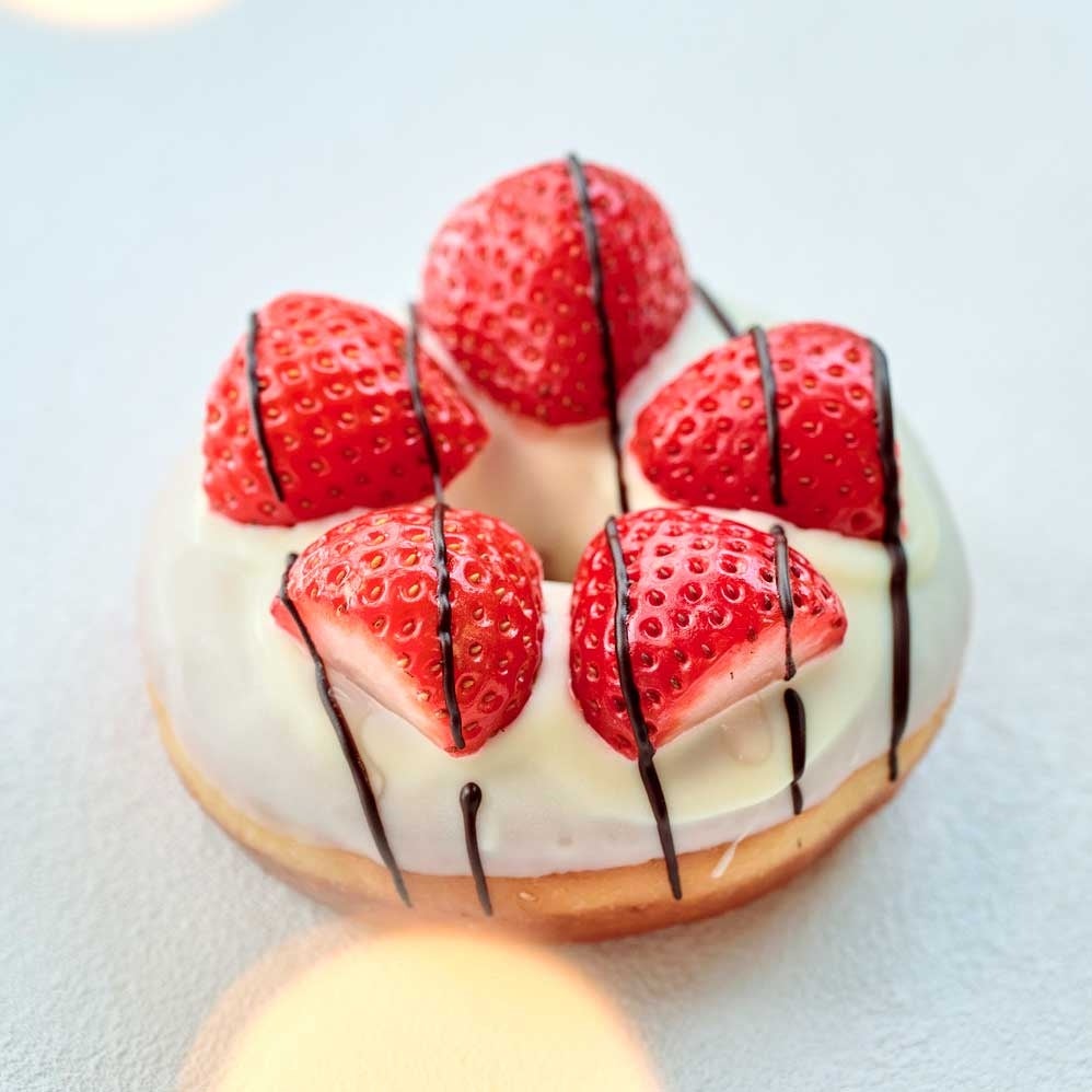 華やかで贅沢な「ストロベリーフラワードーナツ」は、クリスマス時期だけの特別な一品です。ふんわりとしたブリオッシュ生地をホワイトチョコレートでコーティングし、トッピングには新鮮ないちごを丁寧にお花のようにトッピングしました。贅沢にあしらわれたフレッシュストロベリーが、甘く香るホワイトチョコと絶妙にマッチ。見た目も味わいも華やかで、クリスマスのテーブルを彩ります。
