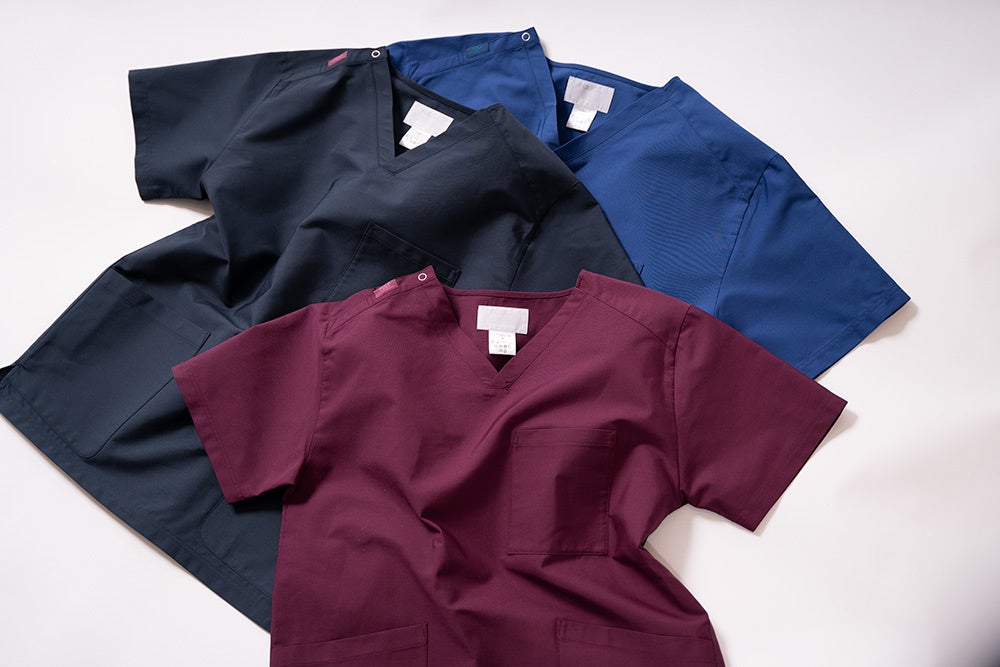 胸ポケット、両腰ポケットと肩ボタンのみのシンプルな設計で、病院クリニックや歯科医院はもちろん、介護施設、薬局、鍼灸院など様々な医療現場で利用いただけます。カラースクラブの中で最も人気のあるネイビー、ワイン、ダークネイビーの3色を展開しています。