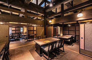 お食事はダイニング「やまてらし」にてご用意いたします。江戸後期の古民家を移築したダイニング。8mの天井高による開放感と、半個室仕様によるプライベート空間を提供します。