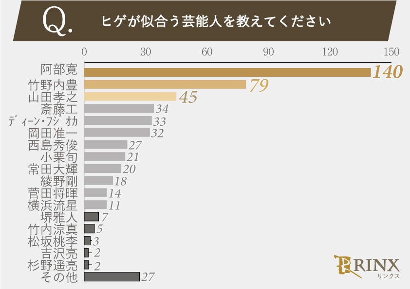最後にヒゲあり派とヒゲなし派の女性両方の300人に「ヒゲが似合う芸能人を教えてください(複数回答)」というアンケートを取ってみたところ、【1位:阿部寛(140票)、2位:竹野内豊(79票)、3位:山田孝之(45票)】と、阿部寛さんがダントツの1位に輝きました。阿部寛さん、竹野内豊さんは人気のヒゲデザインで第1位だった「鼻下+アゴ」スタイルや、アゴからフェイスラインにかけて生やすスタイルにされていることが多いです。山田孝之さんは人気のヒゲデザインで第3位だった「鼻下+口下+フェイスライン+頬」スタイルや第4位の「口下+フェイスライン+もみあげ」スタイルが多いですね。ヒゲの毛量が多く、生えている範囲が広いため幅広いヒゲスタイルが楽しめるタイプです。
