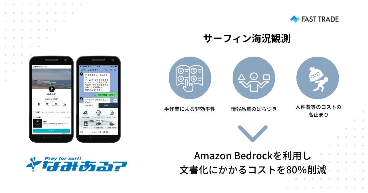 当社は、生成AIを活用したサーファー向け波情報アプリ「なみある?」を提供しており、その取り組みが高く評価され、当セッションへの登壇が実現しました。これまで同サービスにおけるサーフィンの海況観測では、サーフポイントにおける現地の方からのレポートを元に手作業で文書化を実施しており、手作業による非効率性や、情報品質のばらつき、人件費等のコストの高止まりが課題でした。そこでAmazon Bedrockを利用し、生成系AIによる文書の自動作成を行うことで上記の課題を解決し、文書化にかかるコストを80%削減しました。当セッションでは、アプリの開発経緯や今後の展望について発表しました。