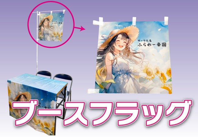 「見つけやすいように目印があればいいのに。出展者もファンの方に見つけてもらいたいに違いない。」という思いから、生まれたブース装飾アイテムが「ブースフラッグセット」です。