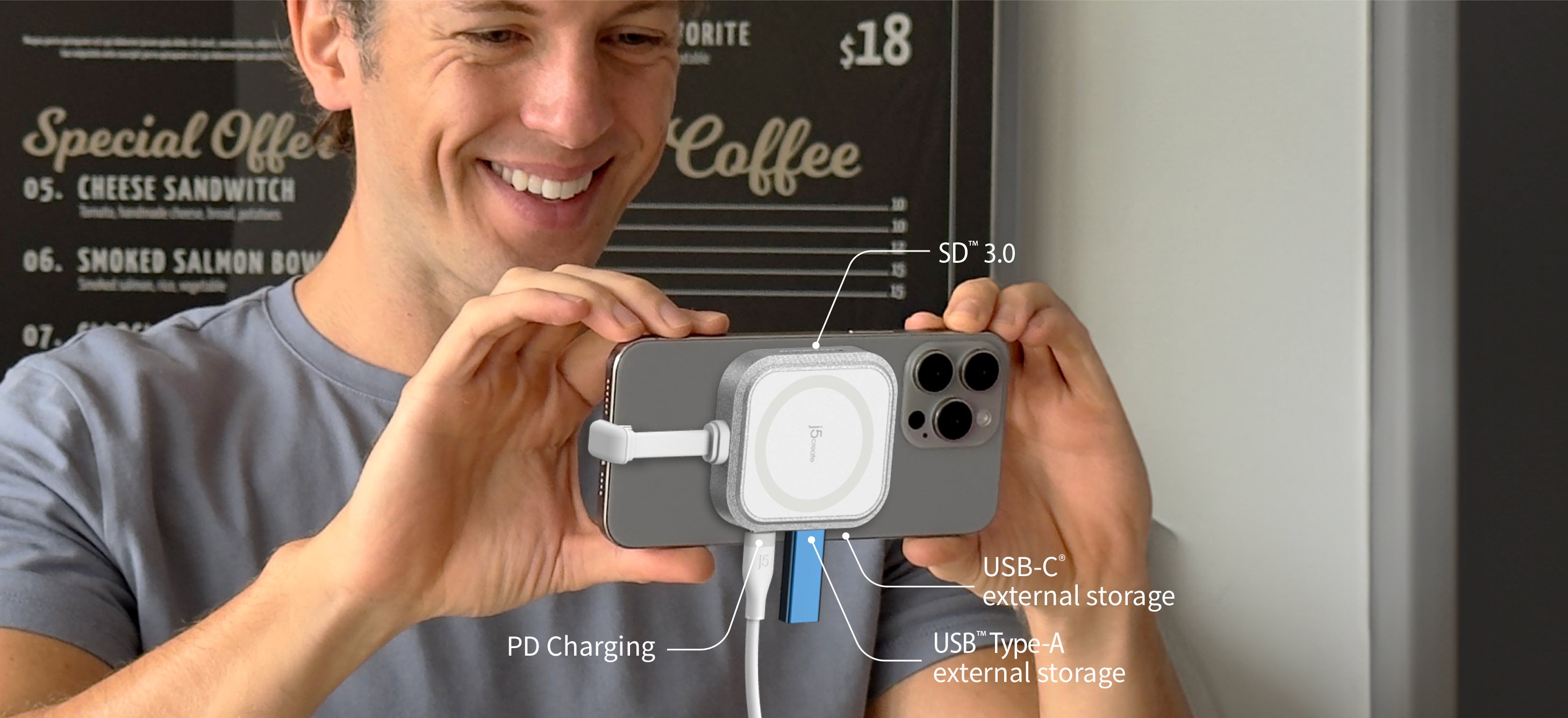 USB-Cポートに接続されたデバイスが、充電器やSSDなどのストレージをスマートに検出し、それに応じた機能を提供します。一般的なUSBハブでは各ポートの機能が固定されていますが、本製品の2つのポートは、どちらに接続してもPD充電とデータ転送の両方に対応しています。iPhoneの背面に固定して使用する際は、どのポートに接続しても安心して使用できます。