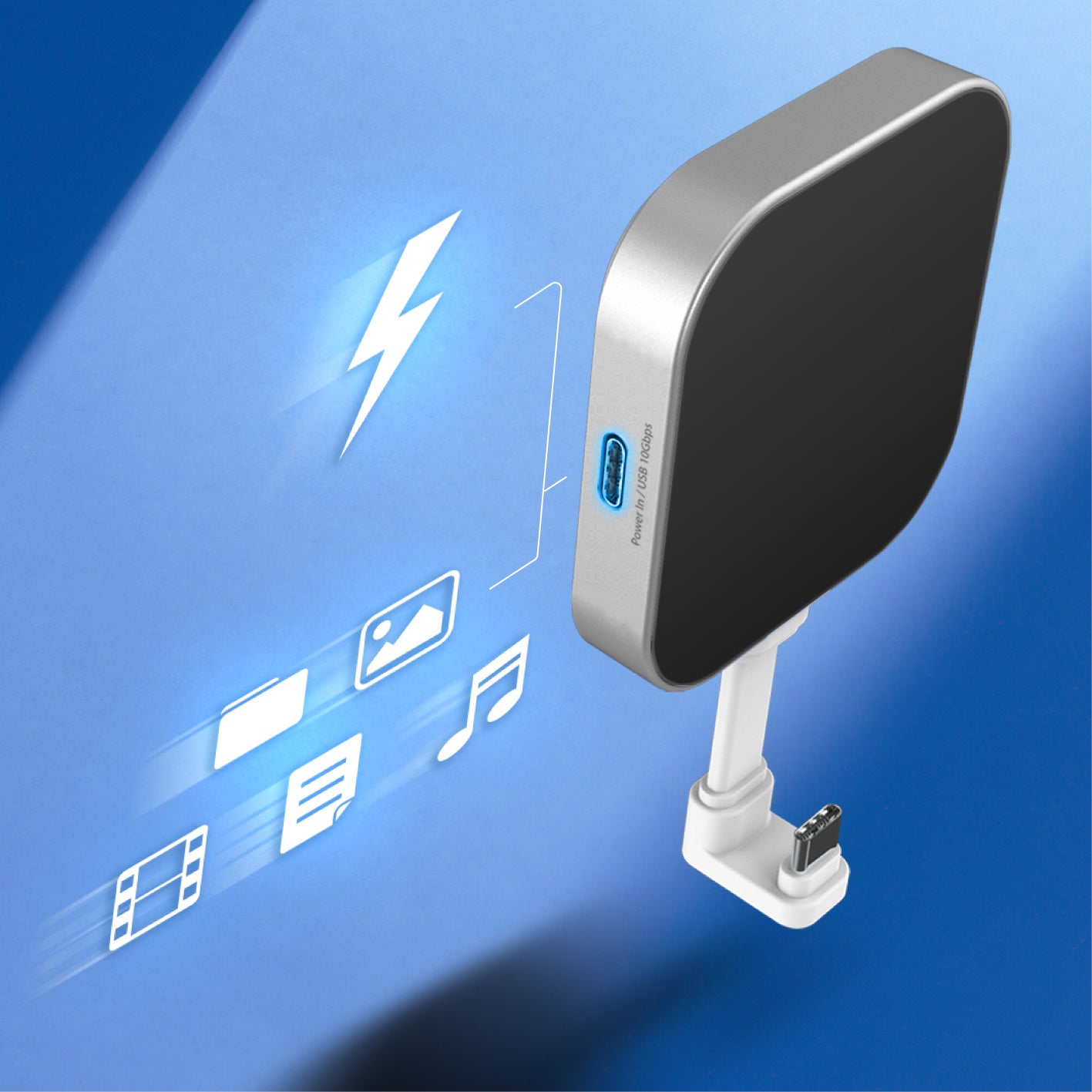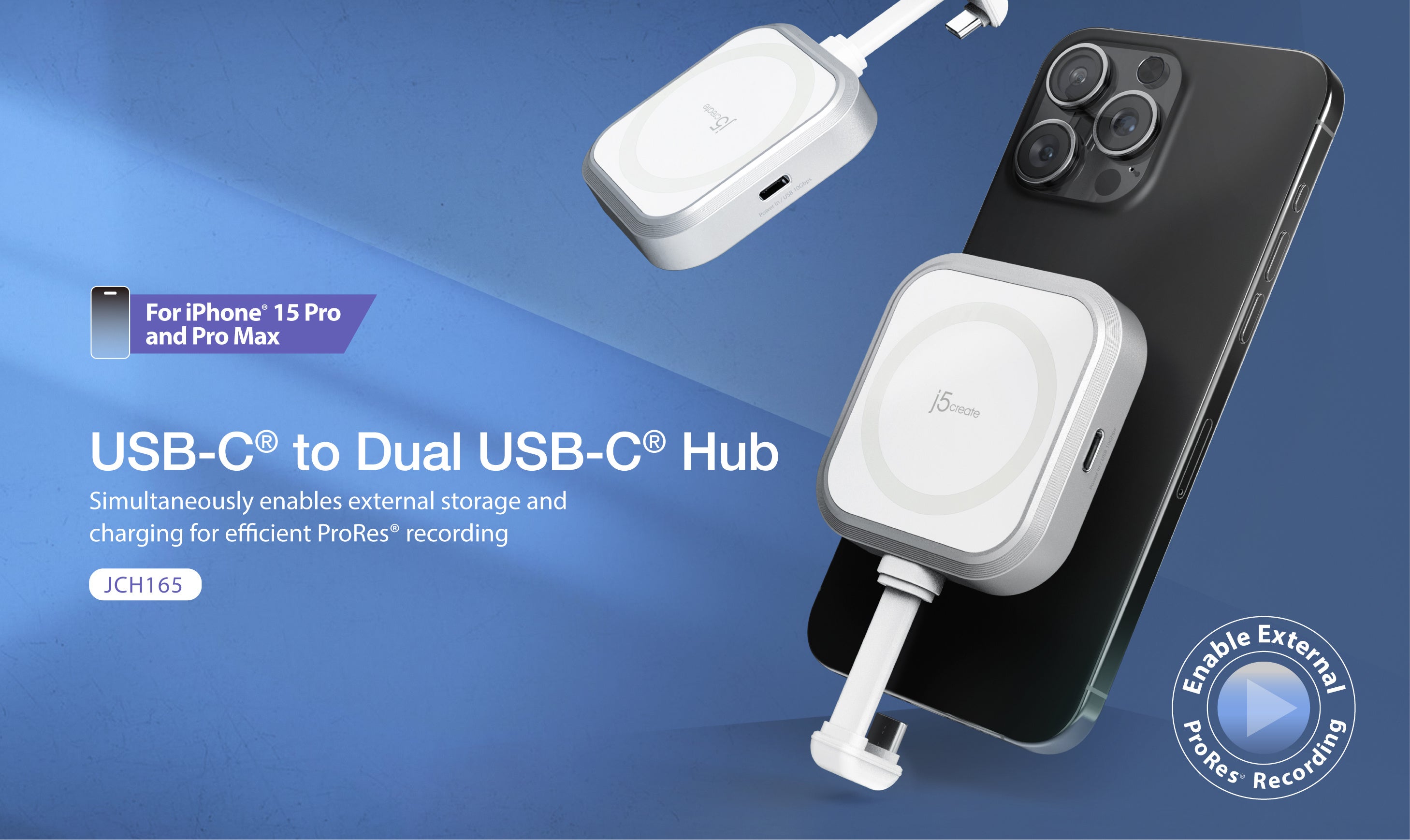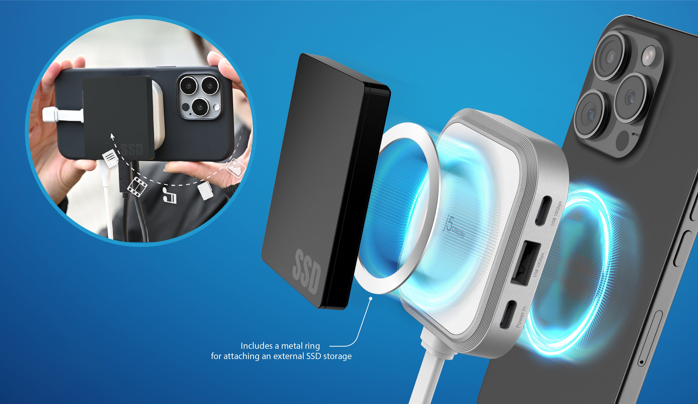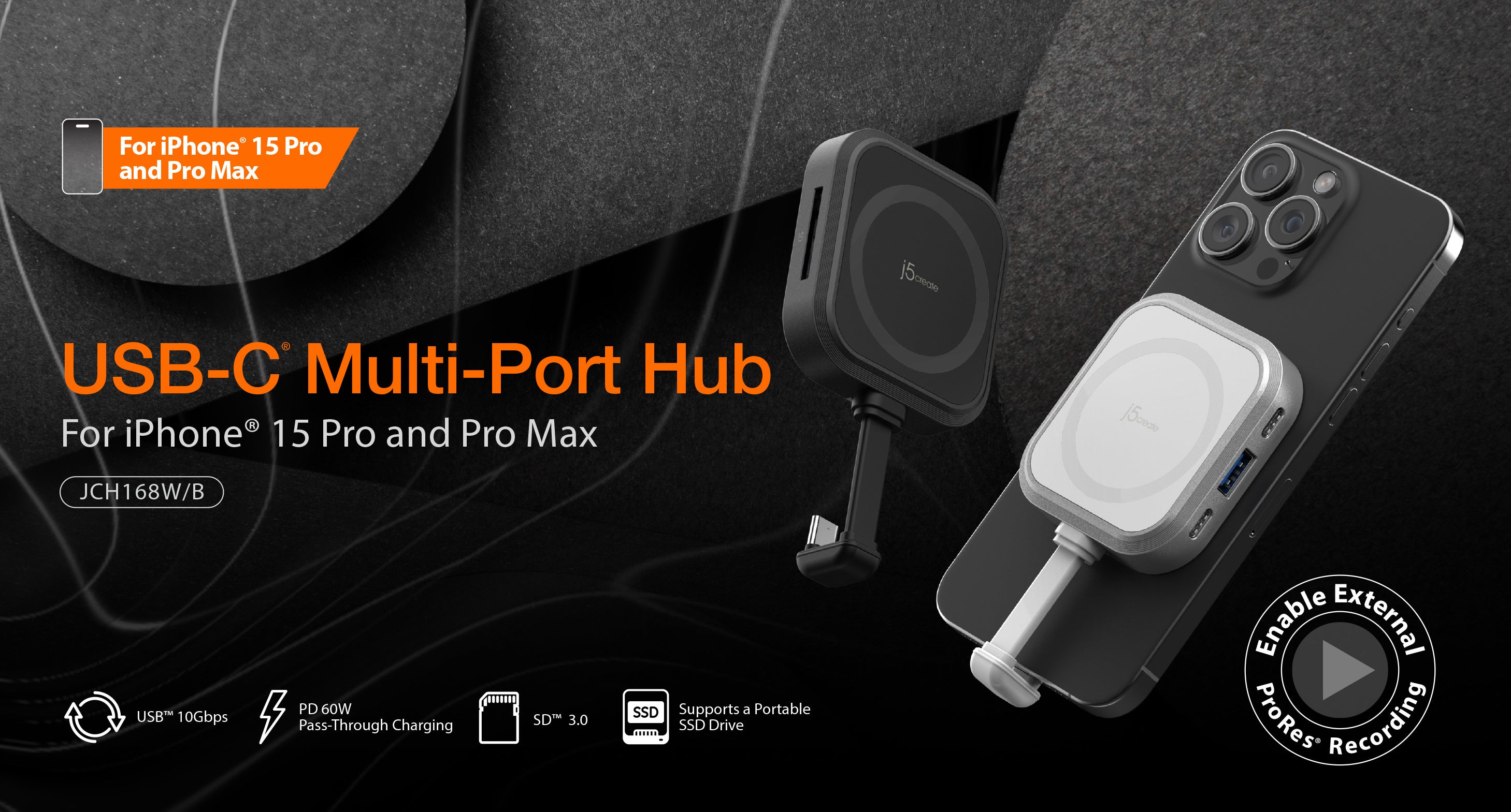 2ポートのUSB-Cにより、1つのポートはiPhoneへのPD充電が可能です。もう1つのポートは、高速のUSB 3.2 Gen2(10Gbps)転送機能を提供し、SSDを接続することで、iPhone Pro / Pro MaxのProRes録画機能をサポートします。これにより、iPhoneを瞬時にプロフェッショナルなカメラに変貌させることができます。