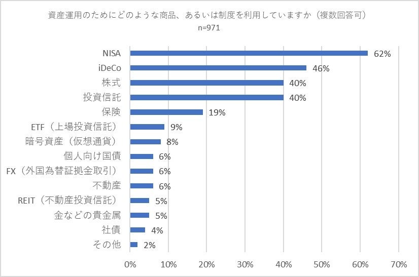 最後に「資産運用を行っている」と回答した971人に「資産運用のためにどのような商品、あるいは制度を利用していますか」と質問しました。その結果、「NISA」が62パーセントでトップとなりました。2位には「iDeCo」が46パーセントで入り、以下「株式」と「投資信託」(ともに40パーセント)、「保険」が19パーセントで続きました。上位2つの回答では制度、3位以下では具体的な商品が選ばれました。