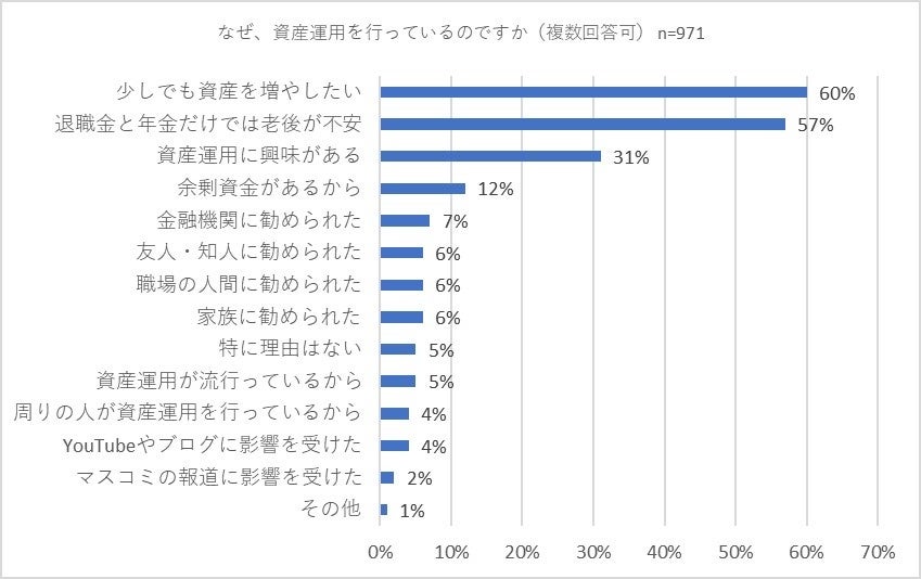 次に、「資産運用を行っている」と回答した971人に「なぜ、資産運用を行っているのですか」(複数回答可)と尋ねました。その結果、「少しでも資産を増やしたい」との回答が60パーセントで最多となりました。2位は「退職金と年金だけでは老後が不安」との回答が57パーセントとトップとほぼ同じ割合で入り、さらに「資産運用に興味がある」(31パーセント)との回答が続きました。