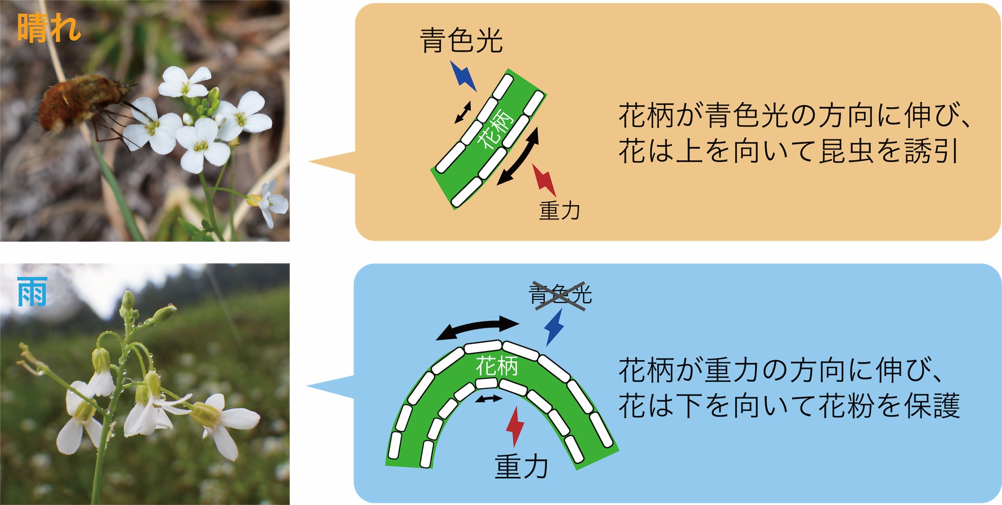 (天候に応じた屈性による花の上下運動は昆虫の誘引と花の保護の両方を満たす)