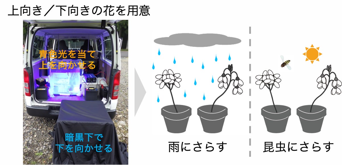 花粉を昆虫に運んでもらう植物は、花を目立たせてアピールする必要があります。一方で、花は雨や風に弱く、昆虫の活動が少ない時には花を守ることも必要です。雨の時に花を見てみると、花を閉じたり下を向いたりしていることに気がつきます。これまで、天候に応じて花の向きを変える意義とメカニズムは分かっていませんでした。本プロジェクトでは、植物がどのように、また何のために花の向きを変えるのかを明らかにするために、野外調査と操作実験、遺伝子発現解析を行いました。
