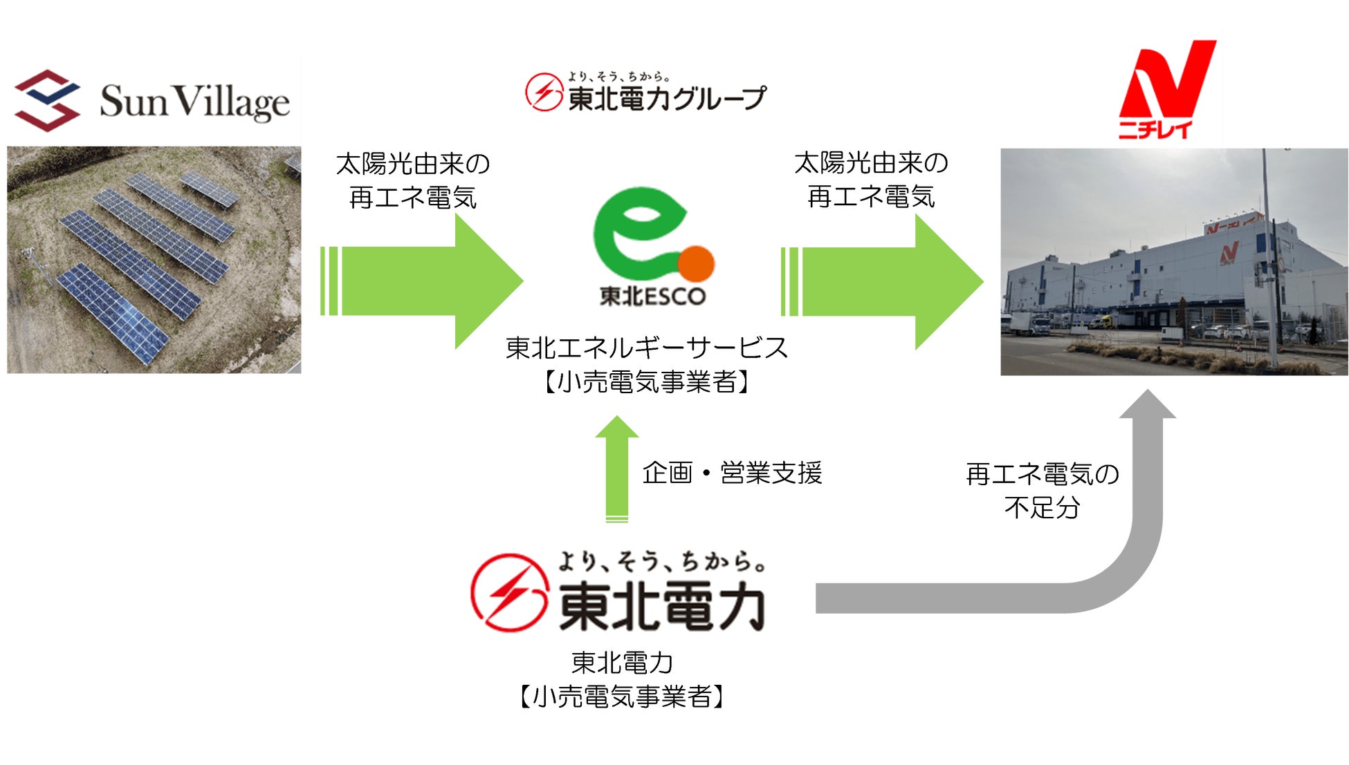 本サービスは、株式会社サンヴィレッジ(本社:栃木県足利市、代表取締役 三村 挑嗣、以下「サンヴィレッジ」)が出資する合同会社グリーンエナジー宮城が保有する太陽光発電所(※2)で発電した再生可能エネルギー(以下「再エネ」)由来の電力を、小売電気事業者である東北ESCOがニチレイのグループ会社(以下、「ニチレイグループ」)16拠点に、30年間にわたって供給するものです。