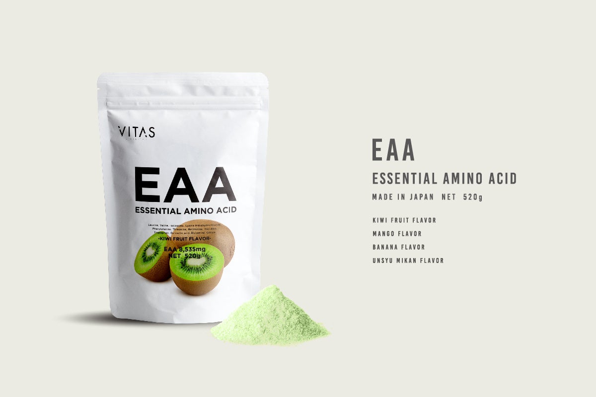 素早く効率よく筋トレをサポートする必須アミノ酸パウダー。キウイ、ライチ、ヨーグルト、温州みかんの4フレーバー展開。