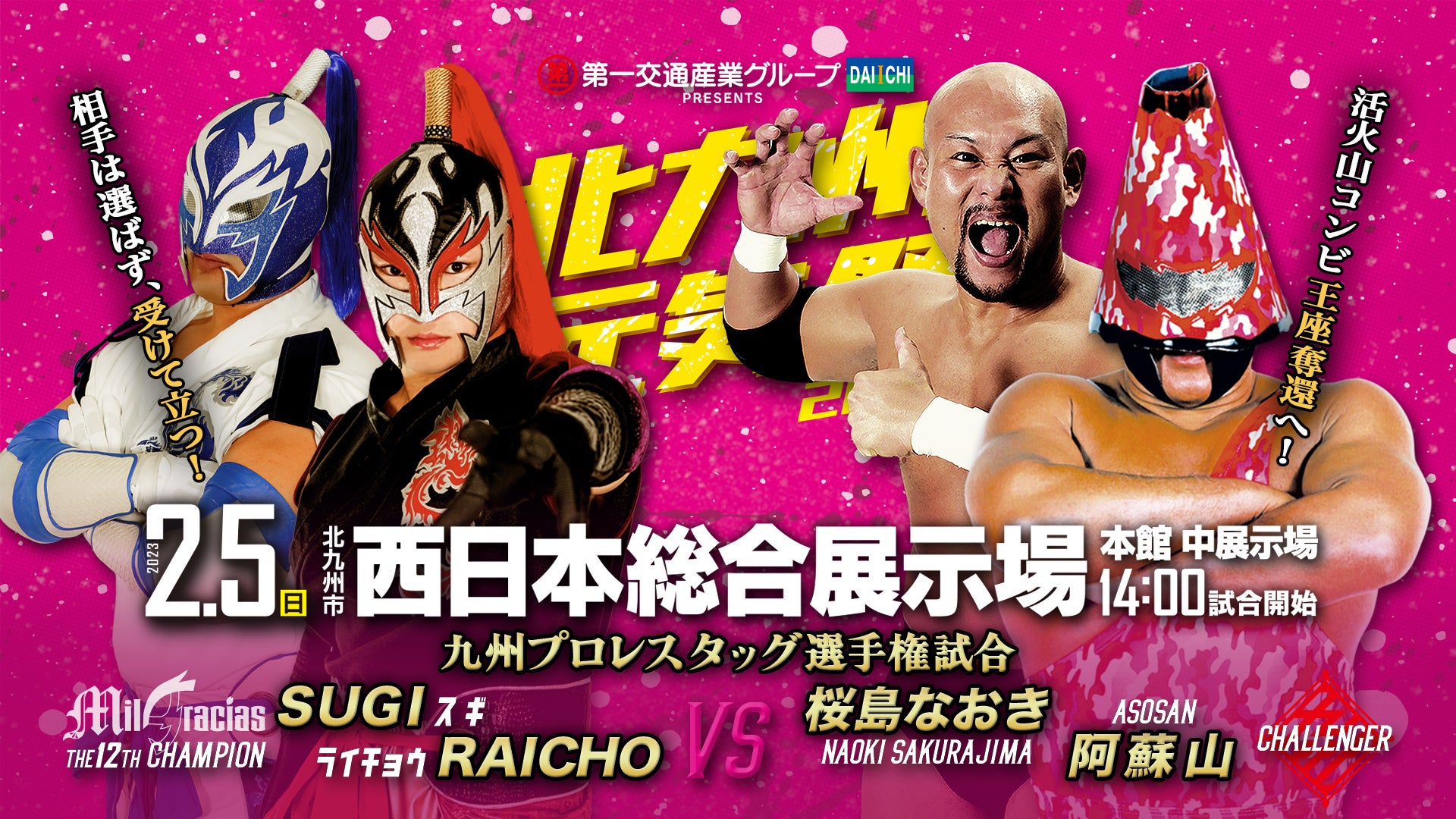 〈九州プロレスタッグ選手権試合〉〜60分1本勝負〜 [王者]SUGI & RAICHO vs 阿蘇山 & 桜島なおき[挑戦者]