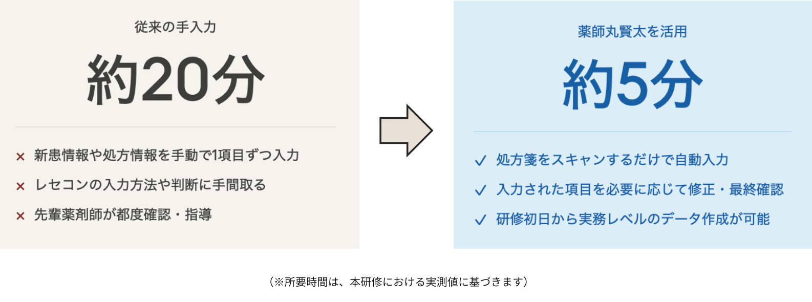 本研修においては、従来の手入力による新規患者登録および処方箋入力に約20分を要していましたが、「薬師丸賢太」を活用することで、処方箋をスキャナで読み込むだけで必要情報を自動でレセコンに反映。これにより基本情報の自動入力は約10秒で完了し、その後の薬剤師による内容確認を含めても、作業時間はトータル約5分となりました。