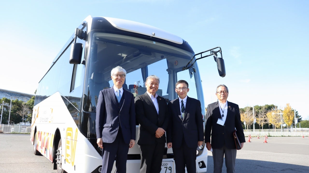 また、当日は国土交通省 事務次官 藤井様、自動車局長 堀内様がお越しくださり、弊社EV観光バスの試乗をしていただきました。