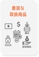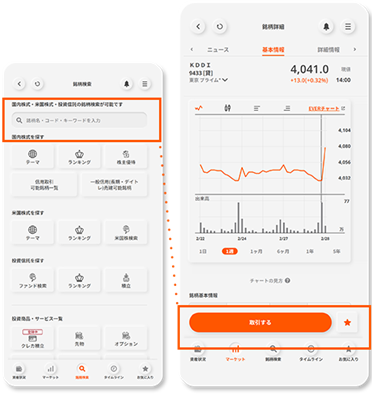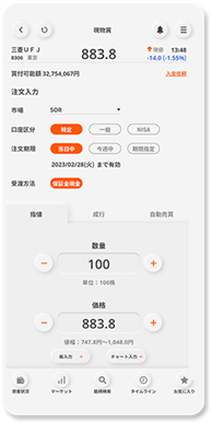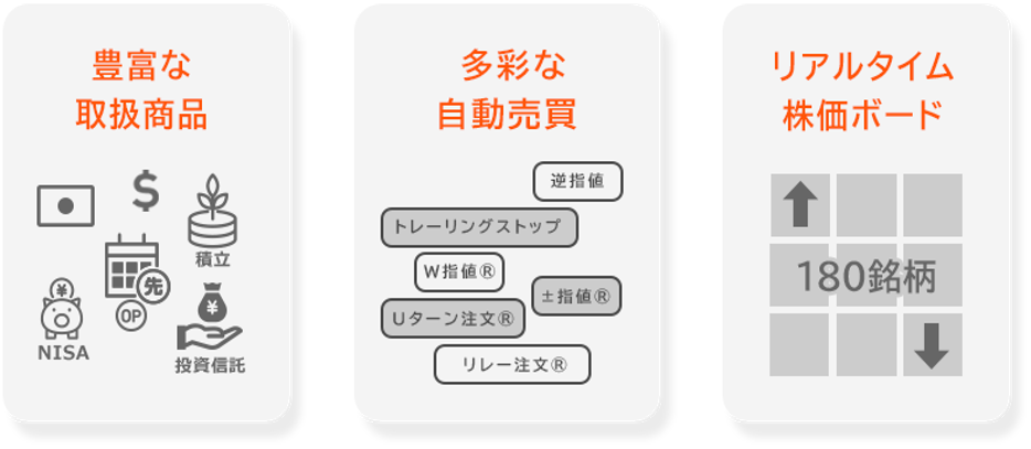 スマホで、国内株式、米国株式、投資信託、先物・オプション、NISA・つみたてNISA、クレカ積立など各商品のお取引が可能です。また、豊富な取扱商品、多彩な自動売買、180銘柄を登録できるリアルタイム株価ボードや高機能チャート(EVERチャート)を有し、総合的な証券取引にご利用いただけます。