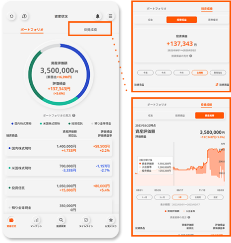 ポートフォリオ画面や投資成績画面で、金融商品ごとの資産評価額、収支、投資損益、資産推移を、シンプルなグラフにより直感的に確認できます。