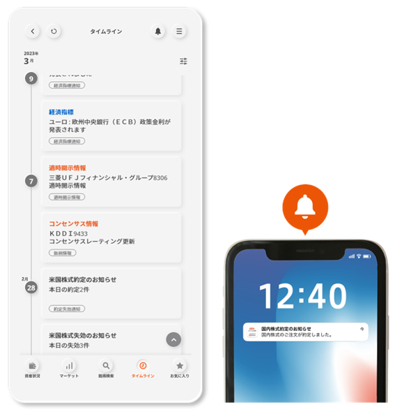 タイムラインにはお取引情報だけでなく、キャンペーン情報や決算情報、経済指標など、パーソナライズされたお客さまの知りたい通知を時系列で配信します。またPush通知でもタイムラインで配信されている情報を通知いたしますので、更新情報をすばやくキャッチアップできるようになります。