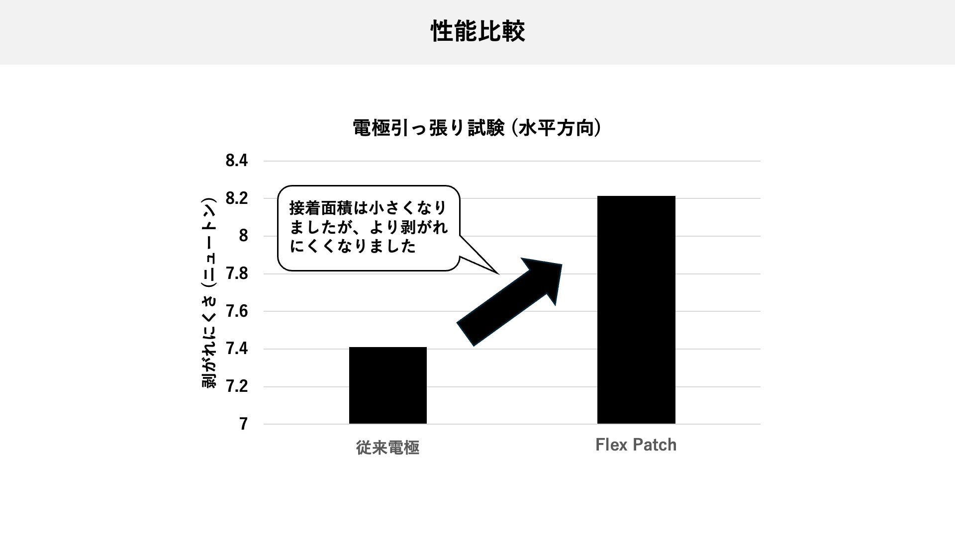 肌に電極を貼り付けた状態で、水平方向に引っ張った際に必要な力を測定し、従来電極とFlex Patchを比較しました。その結果、Flex Patchは従来電極に比べて約10%剥がれにくいことが確認されました。