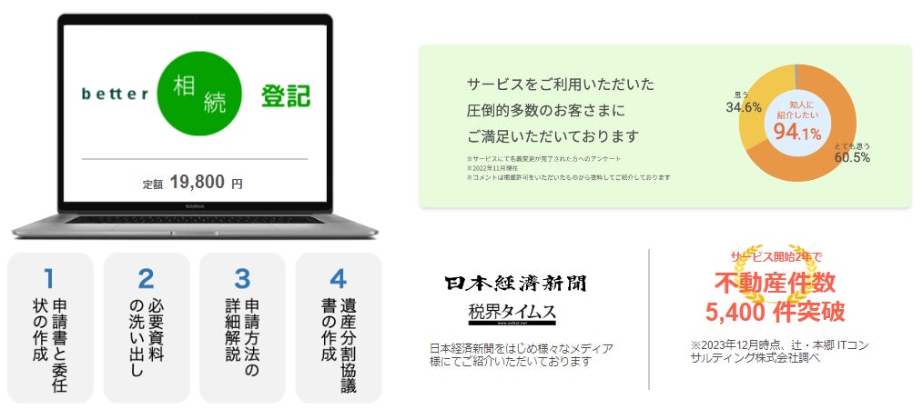 2015年の相続税法改正により、相続税申告の対象者が大幅に増加し、できるだけ税理士報酬を抑えて自分で相続税申告を行いたい方が増えました。このような背景から、2020年に「自分でできる相続税申告 better相続申告(https://jp-better.com/lp/shinkoku/)」を提供開始しました。また、2021年には、「自分でできる相続登記 better相続登記(https://jp-better.com/lp/touki/)」を提供開始しています。2024年4月には、相続登記の義務化が予定され、相続登記を必要とする方が大幅に増える見込みです。better相続の利用者の平均年齢は54歳で、相続手続きが発生する世代の方に幅広くご利用いただいています。