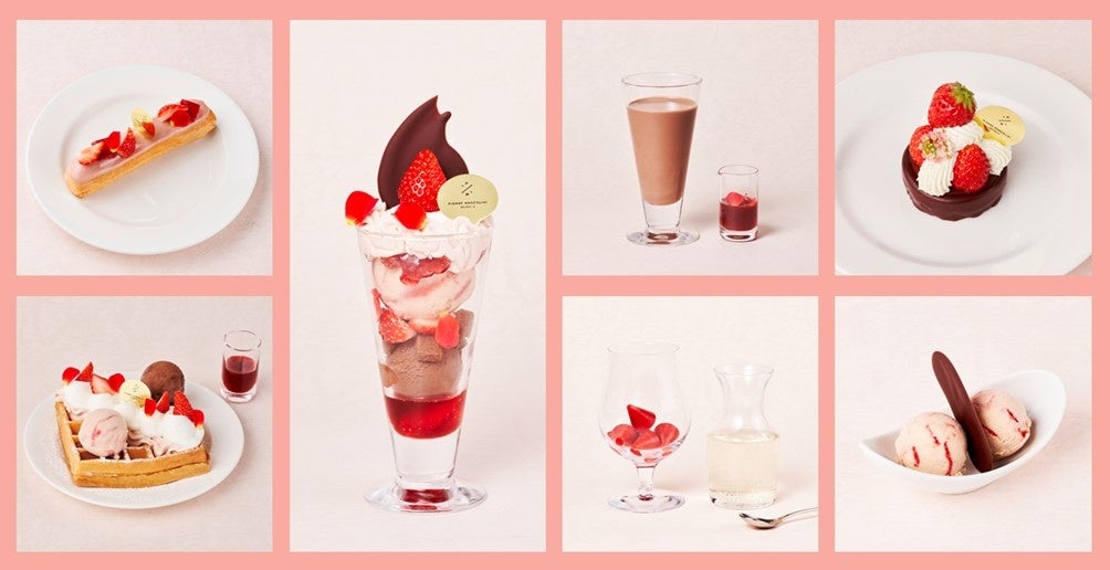 ピエール マルコリーニ 銀座本店と名古屋店のカフェで4月30日(日)までお楽しみいただけます。「エクレア ストロベリー&ローズ」「ショートケーキ ショコラ ブラン」「タルト ショコラ フレーズ」はテイクアウトも可能ですので、ご自宅でもお楽しみいただけます。