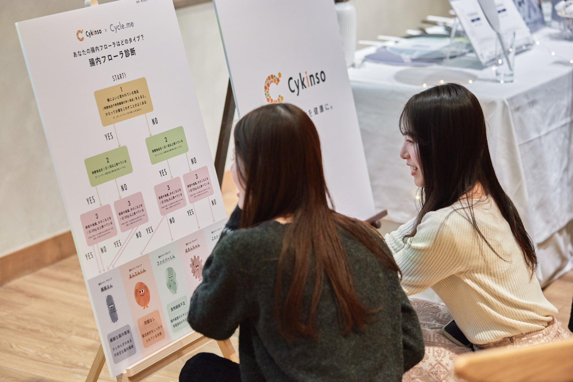 フォトブースには、サイキンソーが監修し、ドットミーがキャラクターデザインを手がけた「腸内フローラ診断」のパネルを展示。Instagramで簡単に診断でき、多くの参加者が自身のタイプに合ったパネルを掲げて写真撮影を楽しんでいました。また、腸内フローラ検査「マイキンソー」や「サイクルミー」も展示しました。