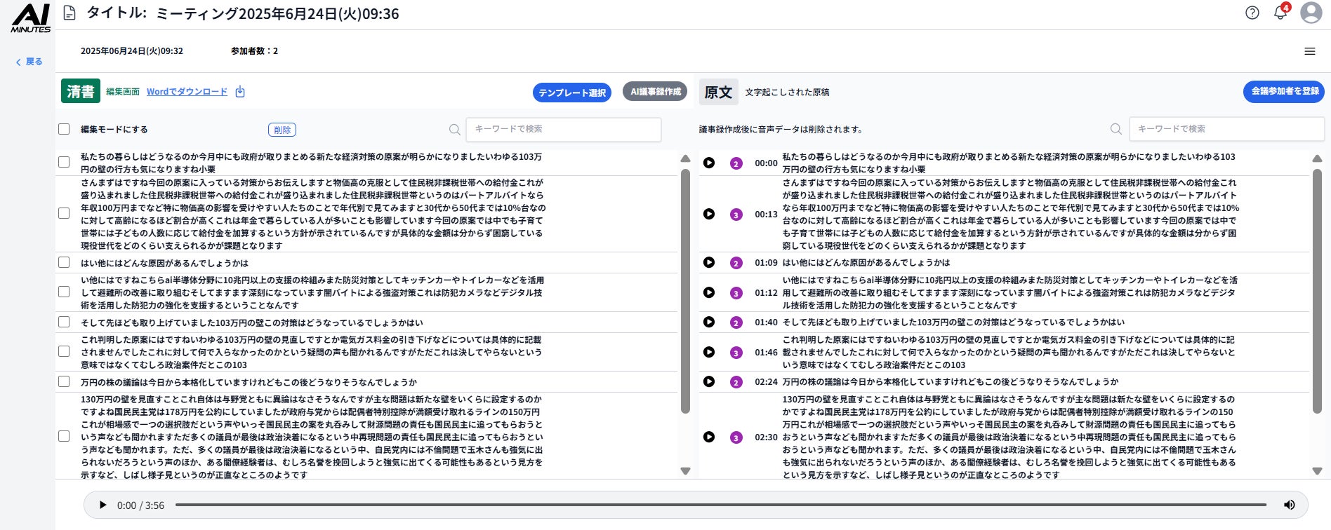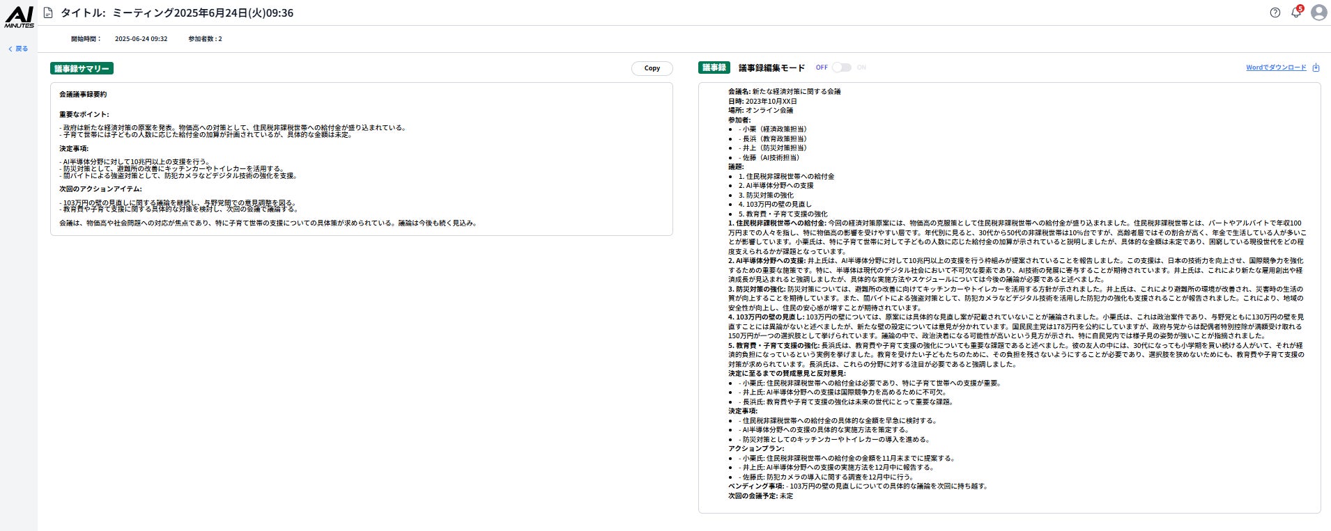 ・AI独自の要約を記載 ・テンプレートに沿った議事録を作成