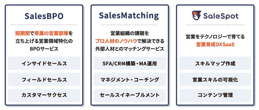 弊社はSaaS/HR業界の営業組織に必要な「人材・ナレッジ・プロダクト」を一気通貫して提供できるサービスラインナップをご用意しています。インサイドセールス、フィールドセールス、カスタマーサクセスなど営業組織に必要なリソースを短期で調達できるBPOサービスから、SFA/CRMの構築やMAの運用により営業組織のDXを推進するサービス、営業スキルを可視化し育成業務を効率化する自社開発のSaaSまで営業組織の成長に必要な機能をカスタマイズしてご提供致します。