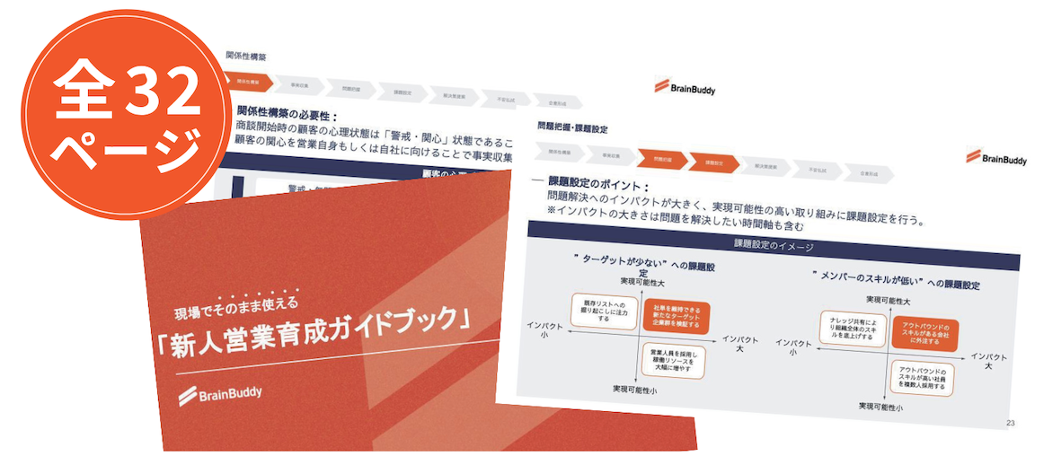 本イベントで名刺交換を頂けた企業様限定で、「現場でそのまま使える【新人営業育成ガイドブック】」をプレゼントしております。新人営業の方に身につけてほしい基本的な考え方を全32ページの研修資料にまとめており、社内の研修コンテンツとしてそのままご活用頂けます。本イベントにご参加される際は、ぜひお受け取りください。