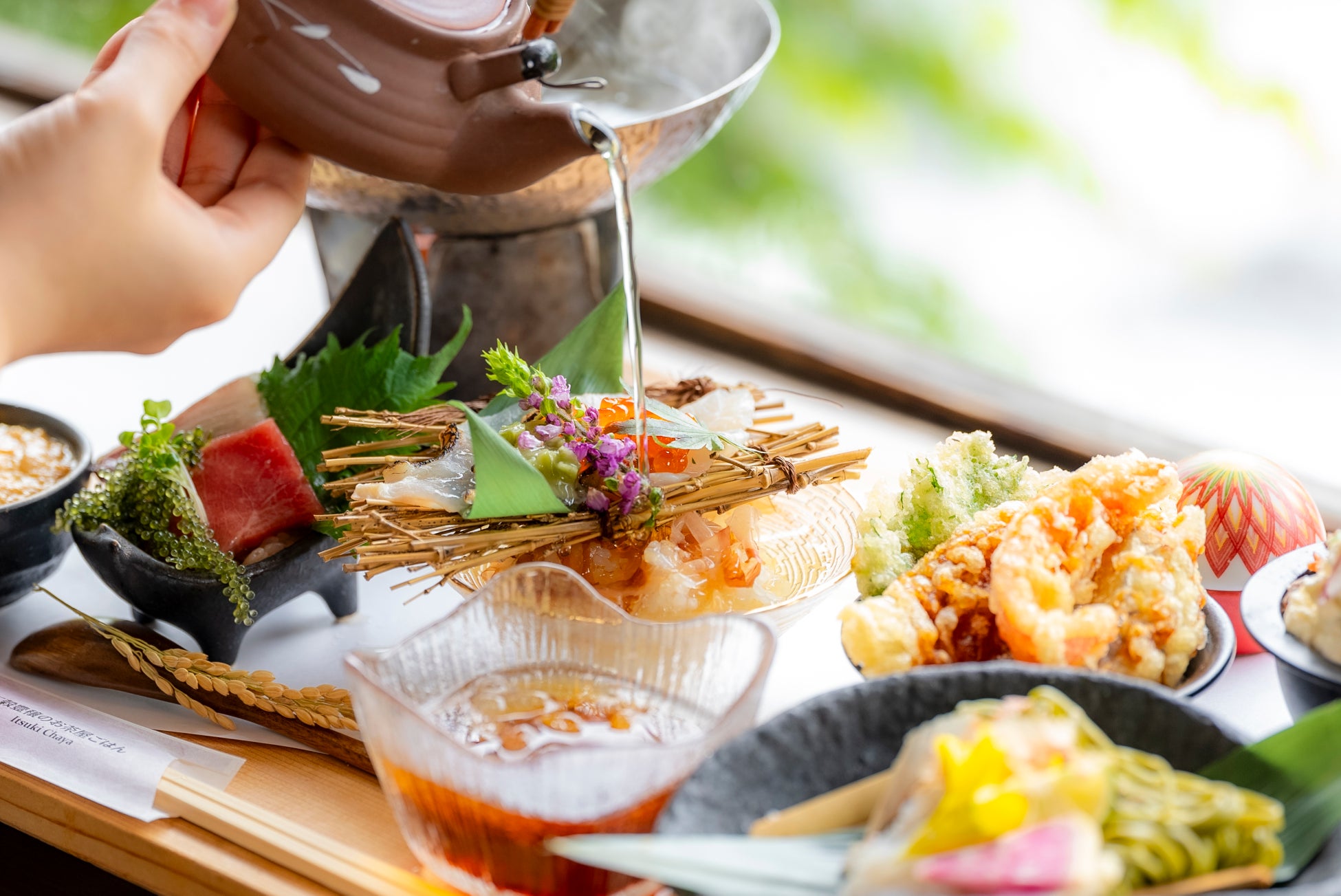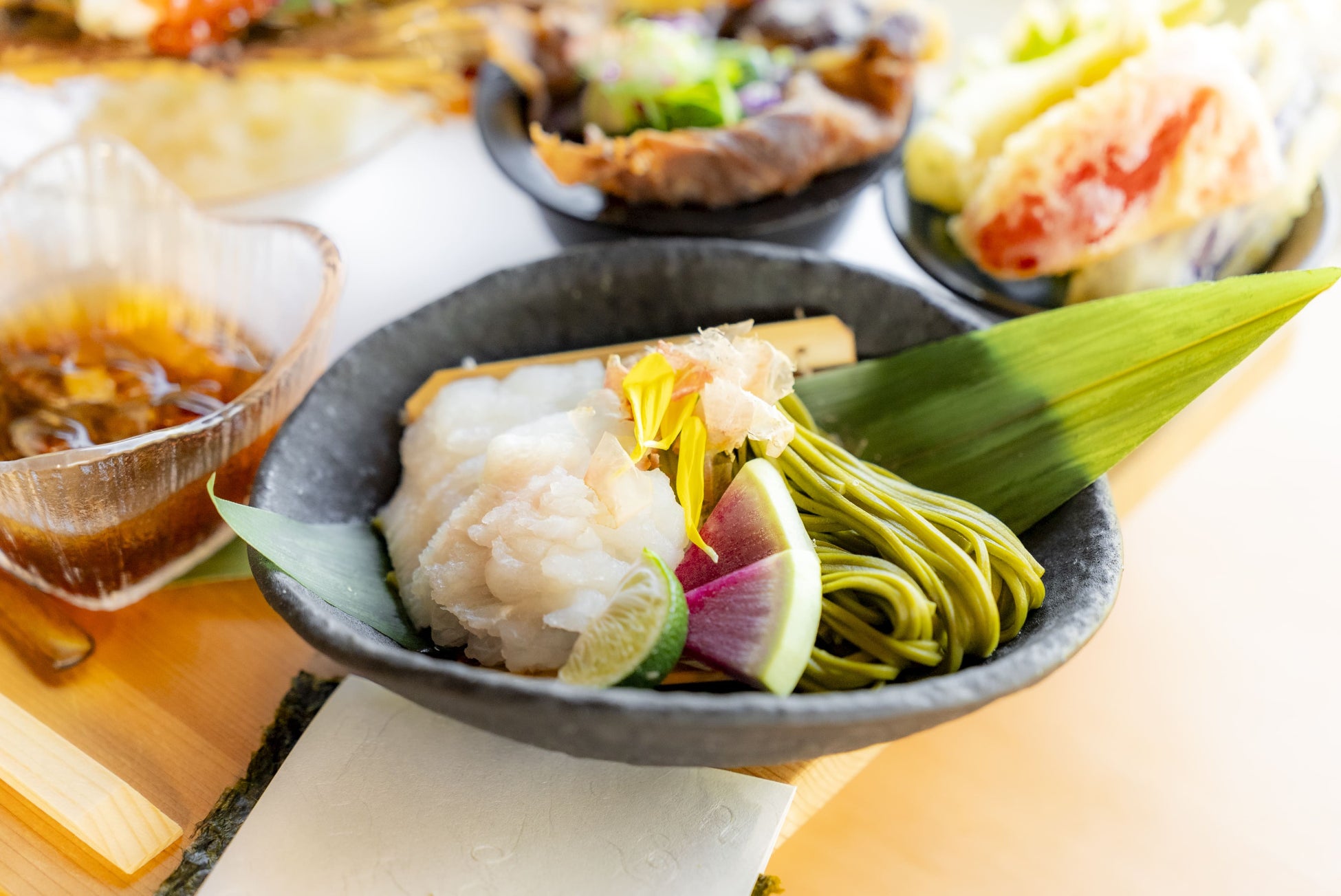 旬の鱧と、京都らしさを感じさせる茶蕎麦をご用意いたしました。