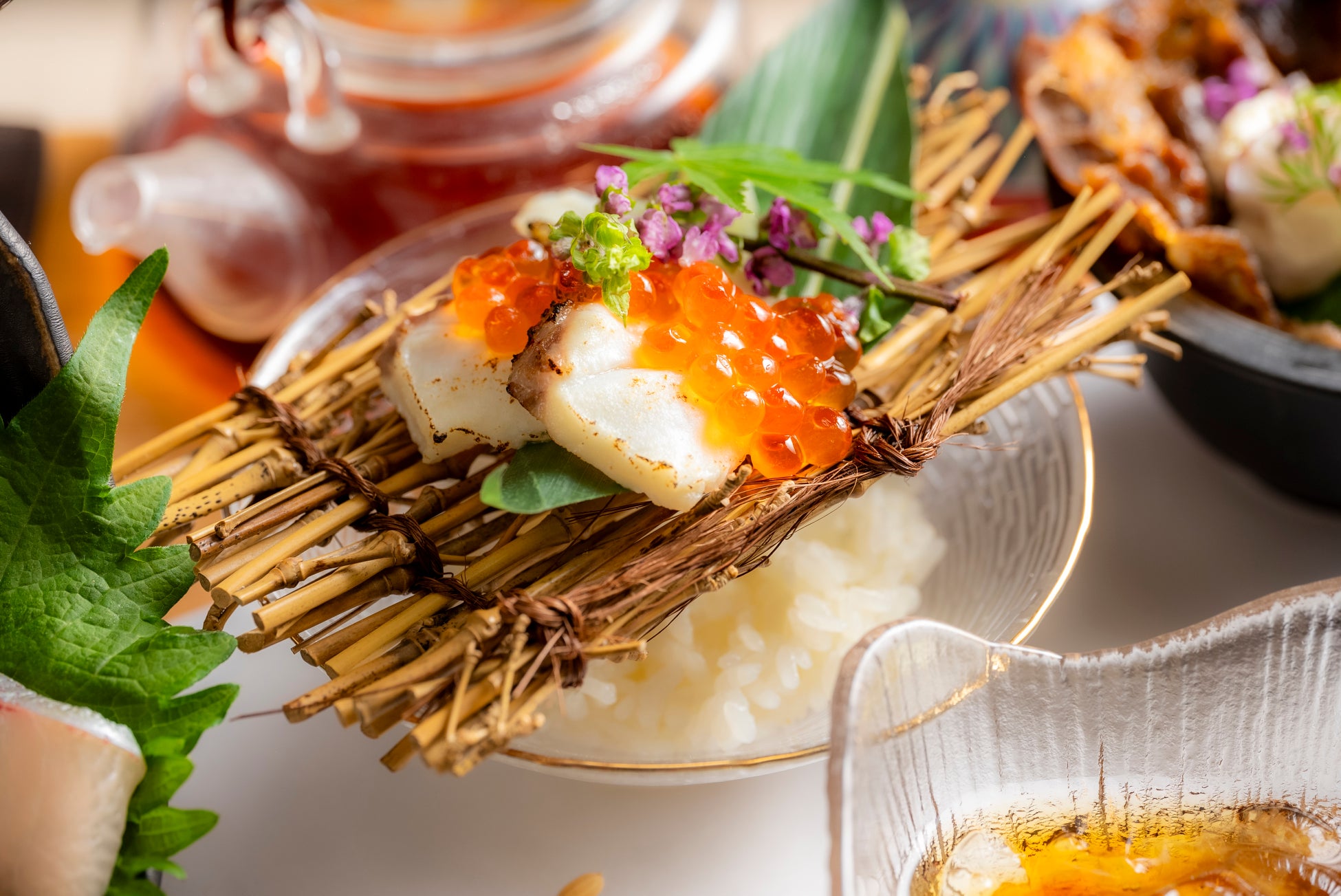 「鯛の炙りといくらの出汁茶漬け」では一口目をそのまま海鮮丼として、二口目はお出汁をかけてお茶漬けとして、そして最後はお好みで薬味を加えてお楽しみいただける特別な丼です。
