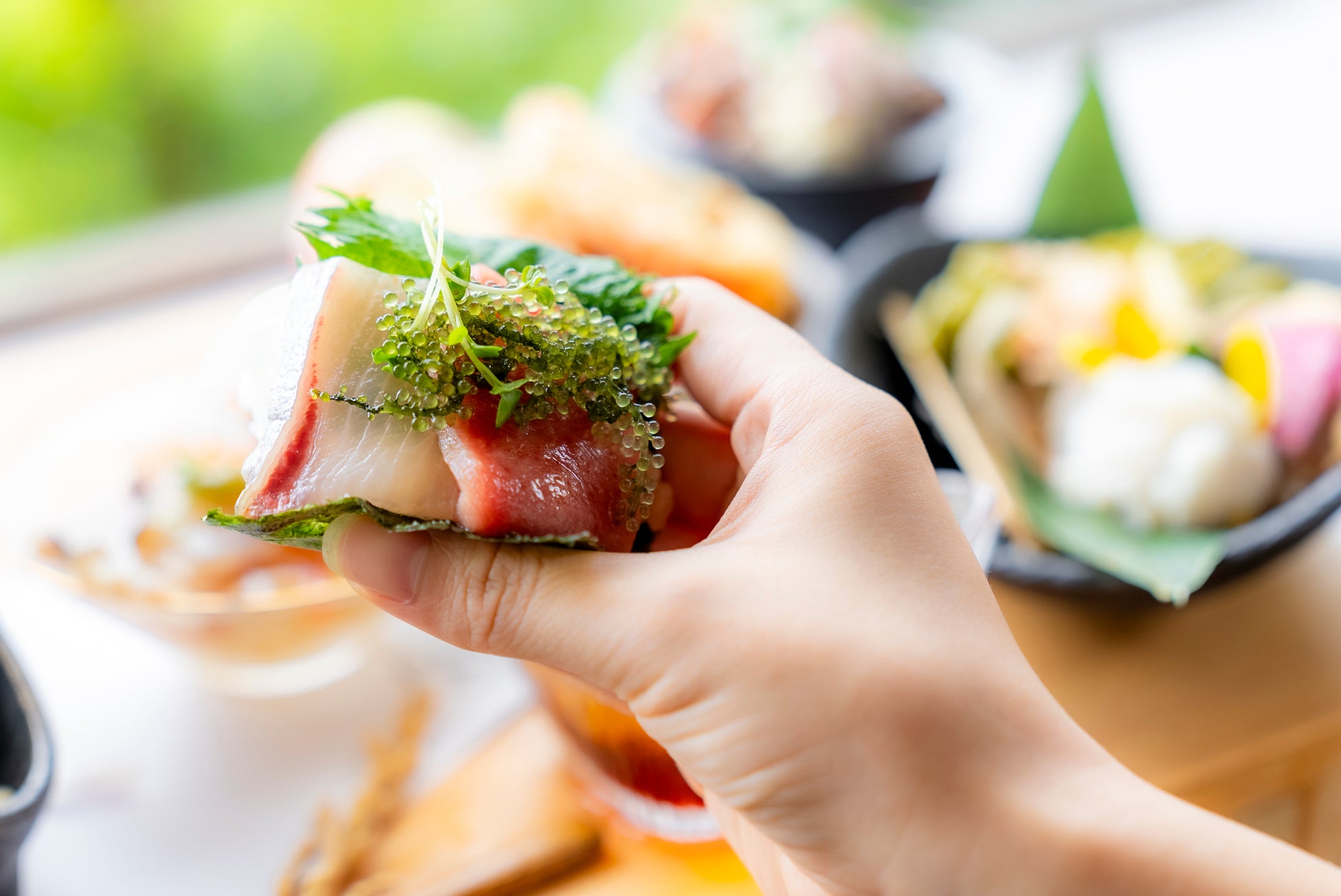 「旬の海鮮手巻き」では海ブドウをたっぷり使用し、プチプチの食感と香り高い海苔と一緒に手巻きにして召し上がりください。程よい塩味が新鮮な海鮮の甘みを引き立ててくれます。
