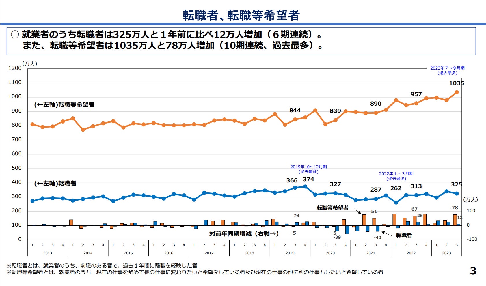 近年、転職希望者は毎年過去最高を記録するなど、増加傾向にあります。統計庁が公開したデータでは、2023年度の転職等希望者は1000万人を超え、人材の流動性が高まっています。