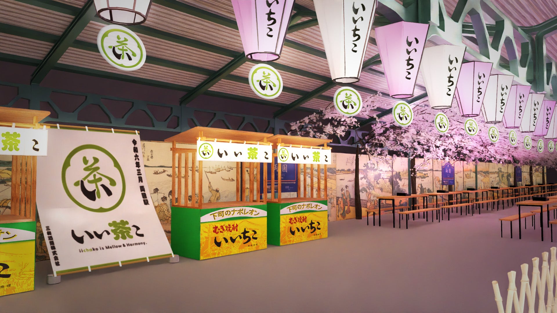 『幻の3番線ホーム』へと繋がる両国駅ステーションギャラリーの入り口では桜に彩られた「いい茶こ 桜ステーション」のタイトルボードがお出迎え。その先にあるホームでは、茶屋をイメージした特設の販売ブースや天井に施された満開の桜という非日常感と特別感ある空間で、風情を感じながらいいちこを緑茶で割った緑茶ハイ「いい茶こ」を楽しんでいただくことができます。
