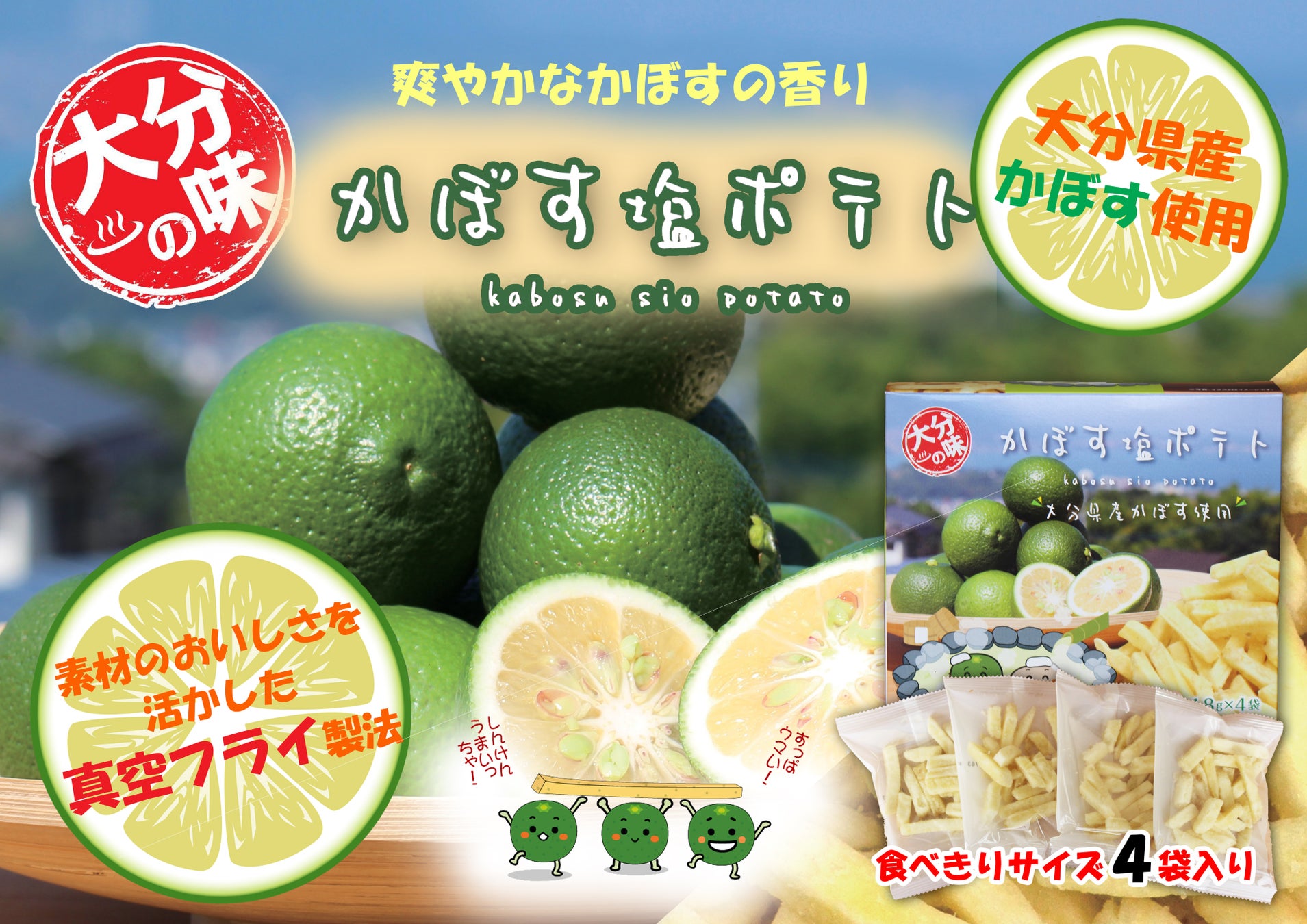 大分県産のかぼすを使用した、すっぱうまいポテトスナック。素材の味を生かすために真空フライ製法を採用しています。