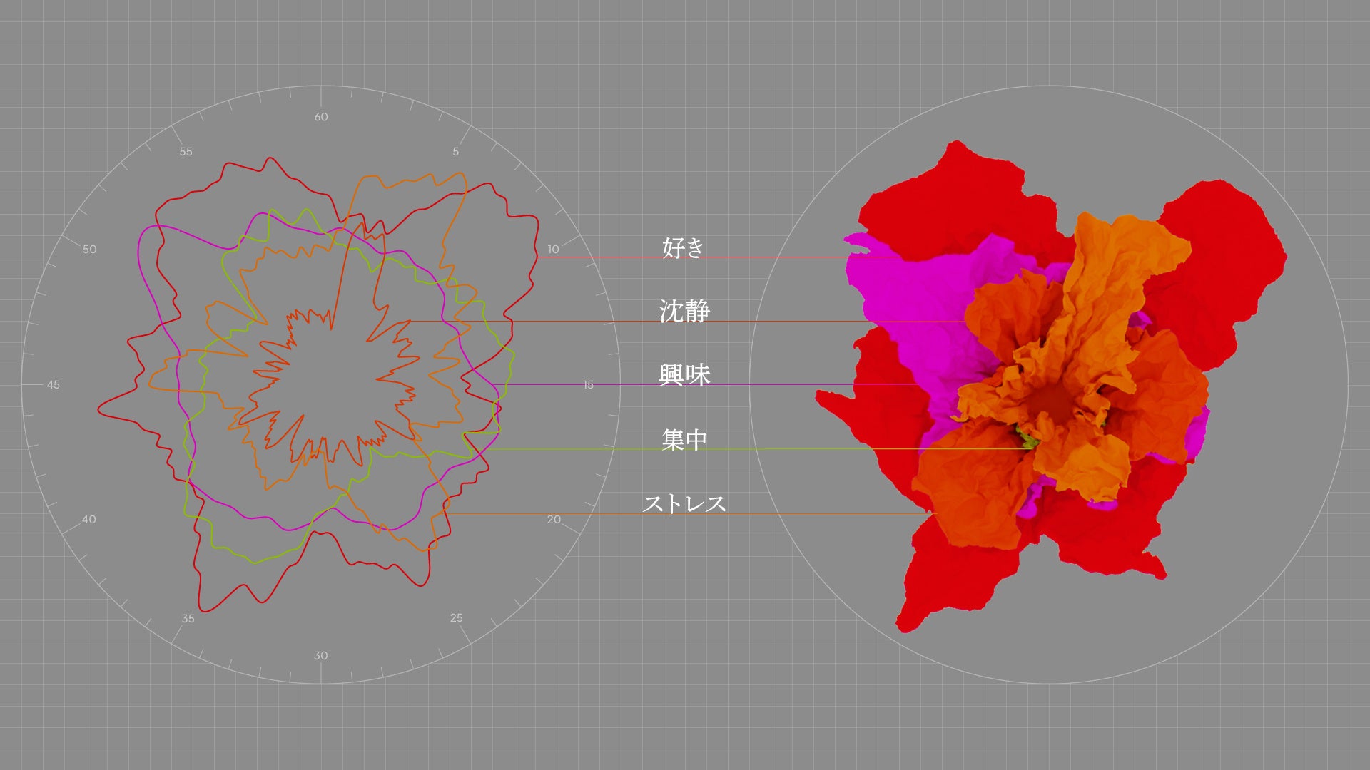 本展示のキービジュアルでは、人が愛する対象を思い浮かべている時の脳波を、脳波測定デバイス「感性アナライザ🄬」で計測し、「花」として可視化しました。制作の過程ではまず被験者に愛する対象について考えてもらい、その脳波を解析することで、「好意」「興味」「集中」「リラックス」「ストレス」の5種類の脳活動を推定しました。その5種類のデータから5層の花弁の形状を生成し、物理シミュレーションにより花として咲かせています。人々が古来から愛を伝える道具の一つとして用いている「花」をモチーフにすることで、テクノロジーにより計測された人の愛情を有機的な表現で可視化することに挑戦しました。