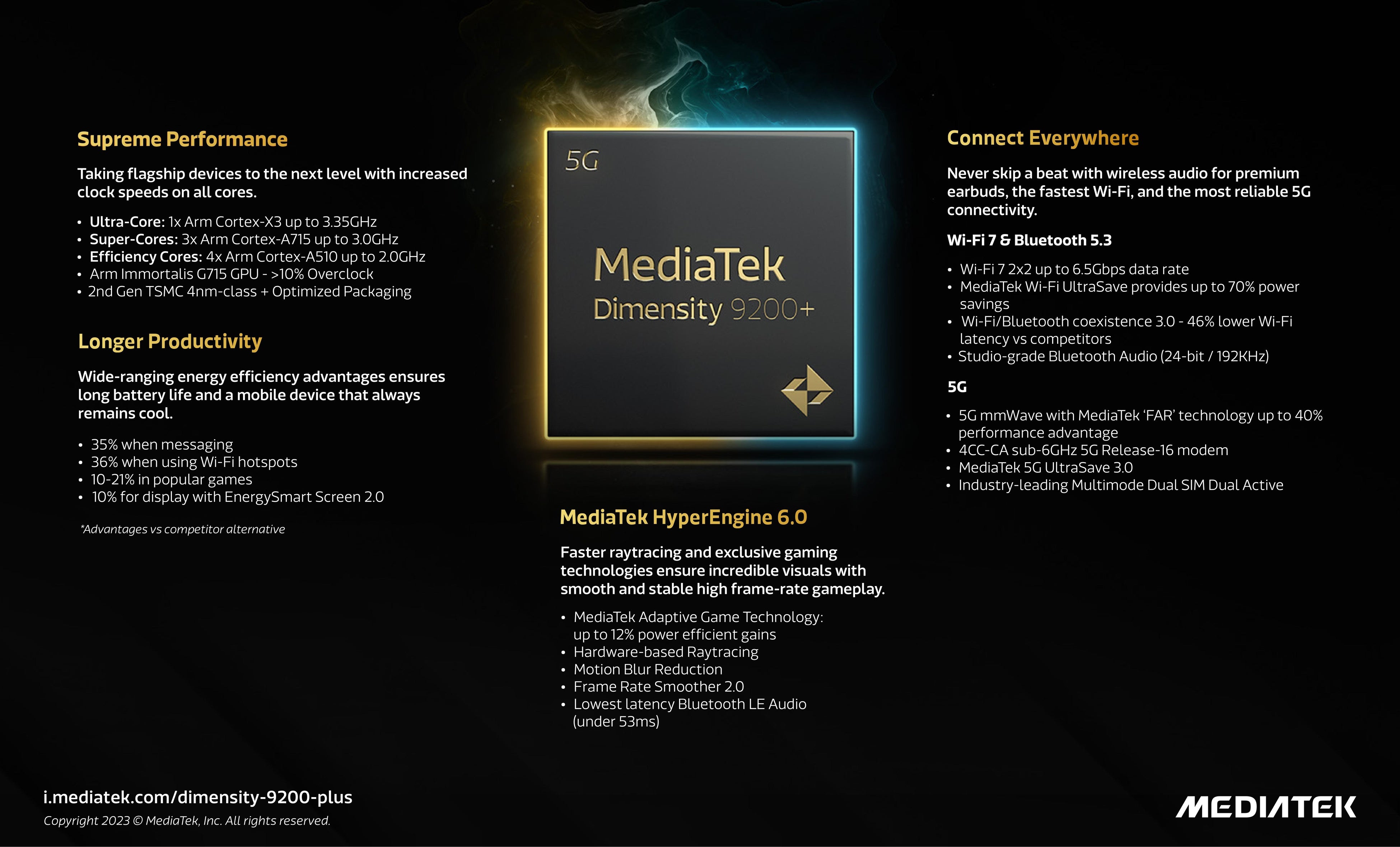 Dimensity 9200+には4CC-CA 5G Release-16モデムが搭載されており、長距離のサブ6GHz接続と超高速のmmWave接続をスムーズに切り替えることができます。また、Bluetooth 5.3に加えて、最大6.5Gbpsのデータレートを備えたWi-Fi 7 2x2+ 2x2にも対応しています。MediaTekのBluetoothとWi-Fiの現行技術により、Wi-Fi、Bluetooth Low Energy(LE)オーディオ、および無線周辺機器を、極めて低遅延で干渉されることなく同時に接続できます。